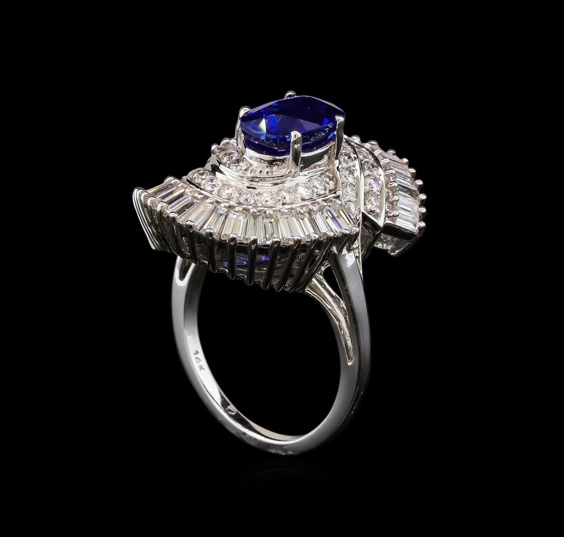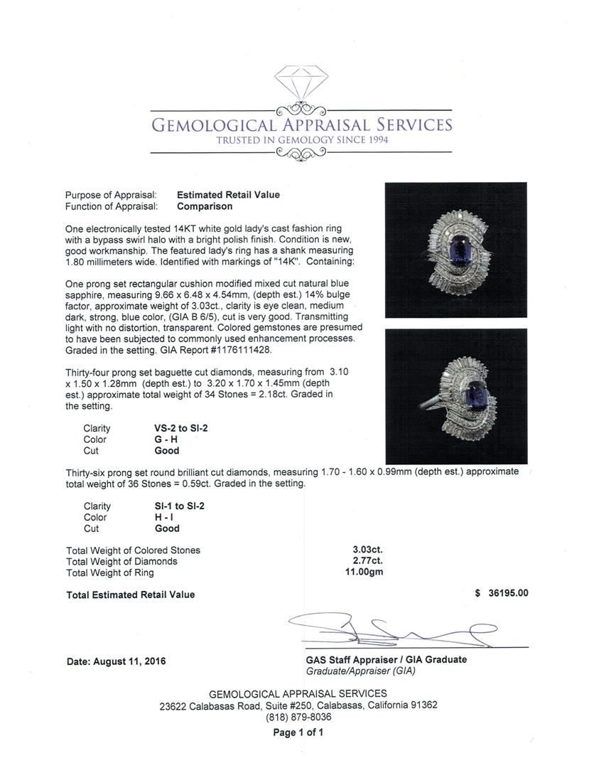 One electronically tested 14KT white gold lady's cast fashion ring with a bypass swirl halo with a bright polish finish. The featured lady's ring has a shank measuring 1.80 millimeters wide. Identified with markings of '14K'. Condition is new, good workmanship. Containing: One prong set rectangular cushion modified mixed cut natural blue sapphire, measuring 9.66 x 6.48 x 4.54mm, (depth est.) 14%. bulge factor, approximate weight of 3.03ct., clarity is eye clean, medium dark, strong, blue color, (GIA B 6/5), cut is very good. Transmitting light with no distortion, transparent. Colored gemstones are presumed to have been subjected to commonly used enhancement processes. Graded in the setting. GIA Report #1176111428. Thirty-Four prong set baguette cut diamonds, measuring from 3.10 x 1.50 x 1.28mm (depth est.) to 3.20 x 1.70 x 1.45mm (depth est.) approximate total weight of 34 Stones = 2.18ct. Graded in the setting. Clarity VS-2 to SI-2. Color: G - H Cut Good Thirty-Six prong set round brilliant cut diamonds, measuring 1.70 - 1.60 x 0.99mm (depth est.) approximate total weight of 36 Stones = 0.59ct. Graded in the setting. Clarity SI-1 to SI-2. Color: H - I Cut Good. Total Weight of Colored Stones 3.03ct.. Total Weight of Diamonds 2.77ct.. Total Weight of Ring 11.00gm. GAS Appraised at $36,195.00.