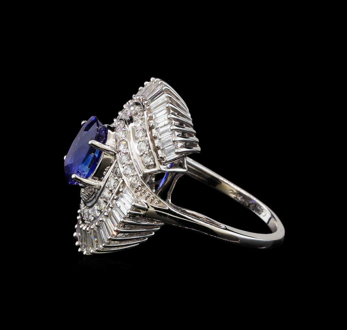 One electronically tested 14KT white gold lady's cast fashion ring with a bypass swirl halo with a bright polish finish. The featured lady's ring has a shank measuring 1.80 millimeters wide. Identified with markings of '14K'. Condition is new, good workmanship. Containing: One prong set rectangular cushion modified mixed cut natural blue sapphire, measuring 9.66 x 6.48 x 4.54mm, (depth est.) 14%. bulge factor, approximate weight of 3.03ct., clarity is eye clean, medium dark, strong, blue color, (GIA B 6/5), cut is very good. Transmitting light with no distortion, transparent. Colored gemstones are presumed to have been subjected to commonly used enhancement processes. Graded in the setting. GIA Report #1176111428. Thirty-Four prong set baguette cut diamonds, measuring from 3.10 x 1.50 x 1.28mm (depth est.) to 3.20 x 1.70 x 1.45mm (depth est.) approximate total weight of 34 Stones = 2.18ct. Graded in the setting. Clarity VS-2 to SI-2. Color: G - H Cut Good Thirty-Six prong set round brilliant cut diamonds, measuring 1.70 - 1.60 x 0.99mm (depth est.) approximate total weight of 36 Stones = 0.59ct. Graded in the setting. Clarity SI-1 to SI-2. Color: H - I Cut Good. Total Weight of Colored Stones 3.03ct.. Total Weight of Diamonds 2.77ct.. Total Weight of Ring 11.00gm. GAS Appraised at $36,195.00.