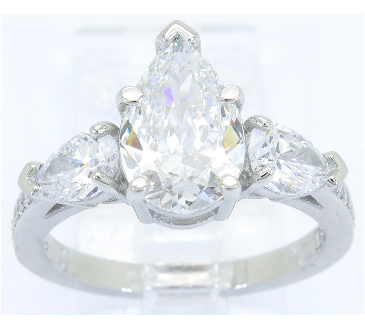 One tested Platinum GIA certified diamond ring. Condition is new. Containing: One Pear cut Diamond. Weight: 2.07CT, Clarity: VS1, Color: E. Two additional Pear Cut Diamonds, and Sixteen Round Brilliant cut Diamonds. Approximate total diamond weight: 3.21CTW. Diamonds are graded in the mounting, unless otherwise stated. Weight of ring: 8.2 grams. Size: 8.0 GIA Appraised.