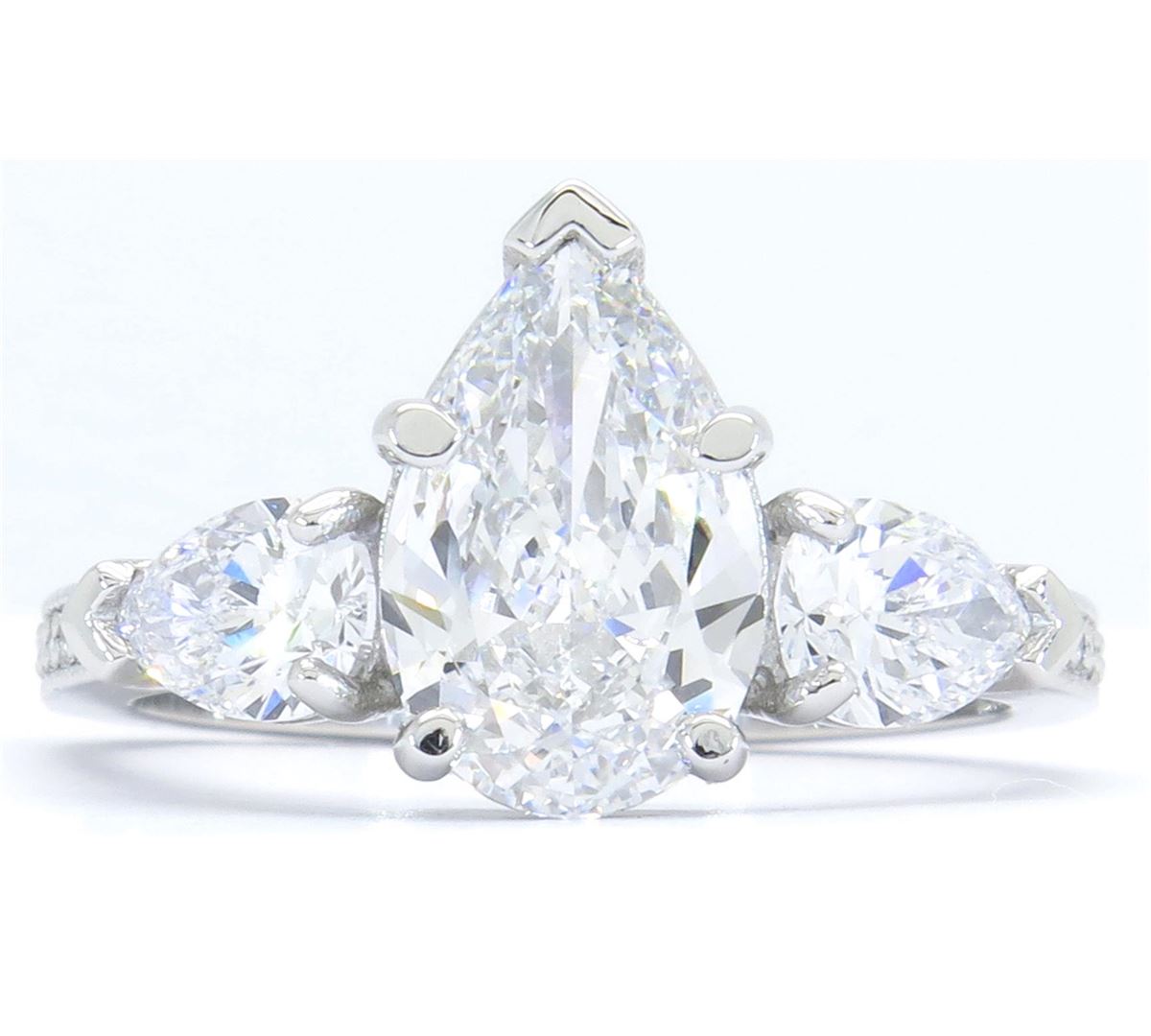 One tested Platinum GIA certified diamond ring. Condition is new. Containing: One Pear cut Diamond. Weight: 2.07CT, Clarity: VS1, Color: E. Two additional Pear Cut Diamonds, and Sixteen Round Brilliant cut Diamonds. Approximate total diamond weight: 3.21CTW. Diamonds are graded in the mounting, unless otherwise stated. Weight of ring: 8.2 grams. Size: 8.0 GIA Appraised.