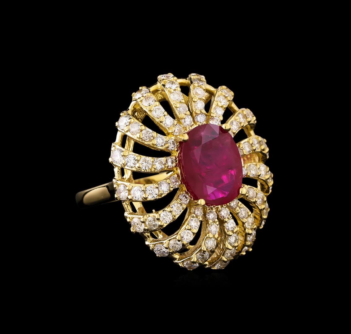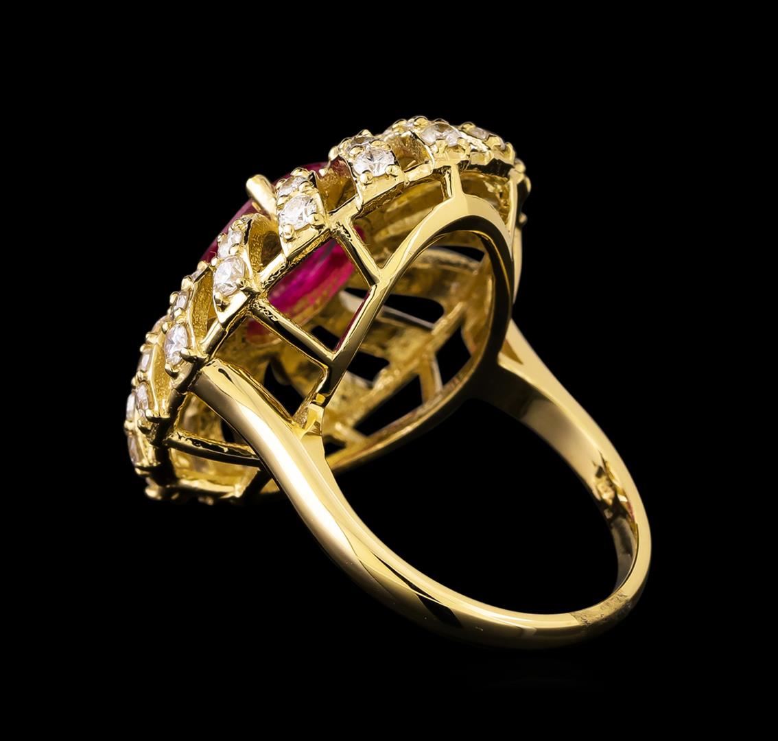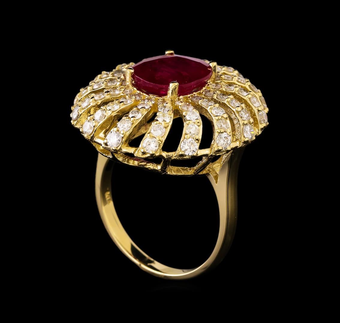 One electronically tested 14KT yellow gold lady's cast fashion ring with a cathedral triple basket halo with a bright polish finish. The featured lady's ring has a shank measuring 2.32 millimeters in width. Identified with markings of 'K14'. Condition is new, good workmanship. Containing: One prong set oval modified mixed cut natural ruby, measuring 10.57 x 8.69 x 3.03mm, (depth est.) 20%. bulge factor, approximate weight of 3.23ct., clarity is heavily included, medium, moderately strong, red color, (GIA R 5/4), cut is very good. Transmitting light somewhat diffusely, transparent to translucent. Indications of laboratory high temperature heat treatment. Naturally occurring internal & external characteristics are present. Colored gemstones are presumed to have been subjected to commonly used enhancement processes. Graded loose prior to setting in the GIA Laboratory, Report #2171603584. Sixteen prong set round brilliant cut diamonds, measuring 2.10 - 2.00 x 1.27mm (depth est.) approximate total weight of 16 Stones = 0.53ct. Graded in the setting. Clarity SI-1 to SI-2. Color: H - I Cut Good Thirty-Two prong set round brilliant cut diamonds, measuring 1.80 - 1.70 x 1.09mm (depth est.) approximate total weight of 32 Stones = 0.65ct. Graded in the setting. Clarity SI-1 to SI-2. Color: H - I Cut Good Thirty-Two prong set round brilliant cut diamonds, measuring 1.65 - 1.60 x 0.98mm (depth est.) approximate total weight of 32 Stones = 0.50ct. Graded in the setting. Clarity SI-1 to SI-2. Color: H - I Cut Good. Total Weight of Colored Stones 3.23ct.. Total Weight of Diamonds 1.68ct.. Total Weight of Ring 9.80gm.