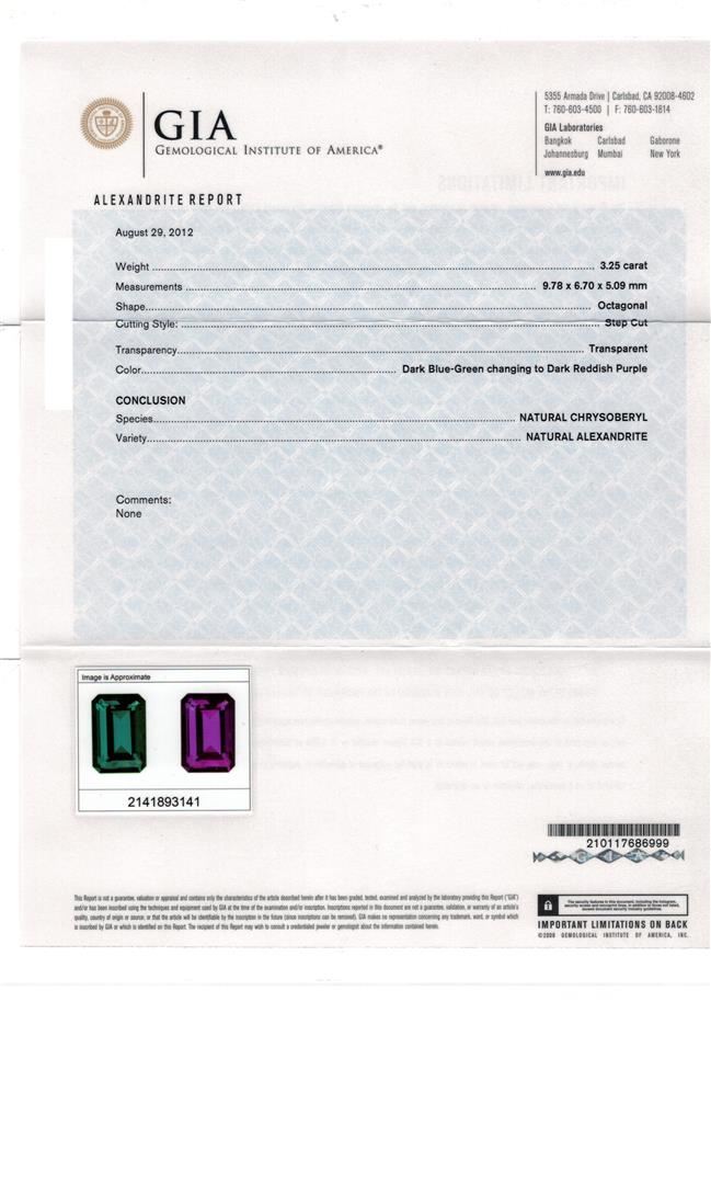 One loose Natural Chrysoberyl / Natural Alexandrite WEIGHT: 3.25 Carat MEASUREMENTS: 9.78 x 6.70 x 5.09mmSHAPE: Octagonal CUTTING STYLE: Step Cut TRANSPARENCY: Transparent COLOR: Dark Blue-Green changing to Dark Reddish Purple GIA Gem Trade Laboratory Report #2141893141.. GAS Appraised at $94,250.00.