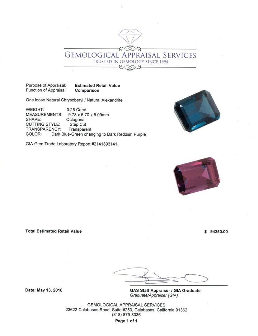 One loose Natural Chrysoberyl / Natural Alexandrite WEIGHT: 3.25 Carat MEASUREMENTS: 9.78 x 6.70 x 5.09mmSHAPE: Octagonal CUTTING STYLE: Step Cut TRANSPARENCY: Transparent COLOR: Dark Blue-Green changing to Dark Reddish Purple GIA Gem Trade Laboratory Report #2141893141.. GAS Appraised at $94,250.00.