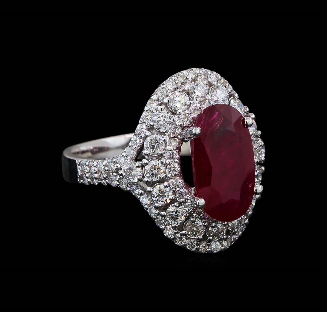 One electronically tested 14KT white gold lady's cast fashion ring with a split shank double halo with a bright polish finish. The featured lady's ring has a shank measuring 2.94 millimeters wide. Identified with markings of 'K14'. Condition is new, good workmanship. Containing: One prong set oval modified mixed cut natural ruby, measuring 11.68 x 6.85 x 4.29mm, (depth est.) 15%. bulge factor, approximate weight of 3.39ct., clarity is heavily included, medium dark, moderately strong, red color, (GIA R 6/4), cut is good. Transmitting light somewhat diffusely, semi-transparent to translucent. Indications of laboratory high temperature heat treatment. Colored gemstones are presumed to have been subjected to commonly used enhancement processes. Graded loose prior to setting in the GIA Laboratory, Report #2175603582. Eighteen prong set round brilliant cut diamonds, measuring 2.10 - 2.00 x 1.27mm (depth est.) approximate total weight of 18 Stones = 0.60ct. Graded in the setting. Clarity SI-1 to SI-2. Color: H - I Cut Good Seventy-Four prong set round brilliant cut diamonds, measuring 1.30 - 1.25 x 0.79mm (depth est.) approximate total weight of 74 Stones = 0.60ct. Graded in the setting. Clarity SI-1 to SI-2. Color: H - I Cut Good. Total Weight of Colored Stones 3.39ct.. Total Weight of Diamonds 1.20ct.. Total Weight of Ring 5.70gm. GAS Appraised at $11,230.00.