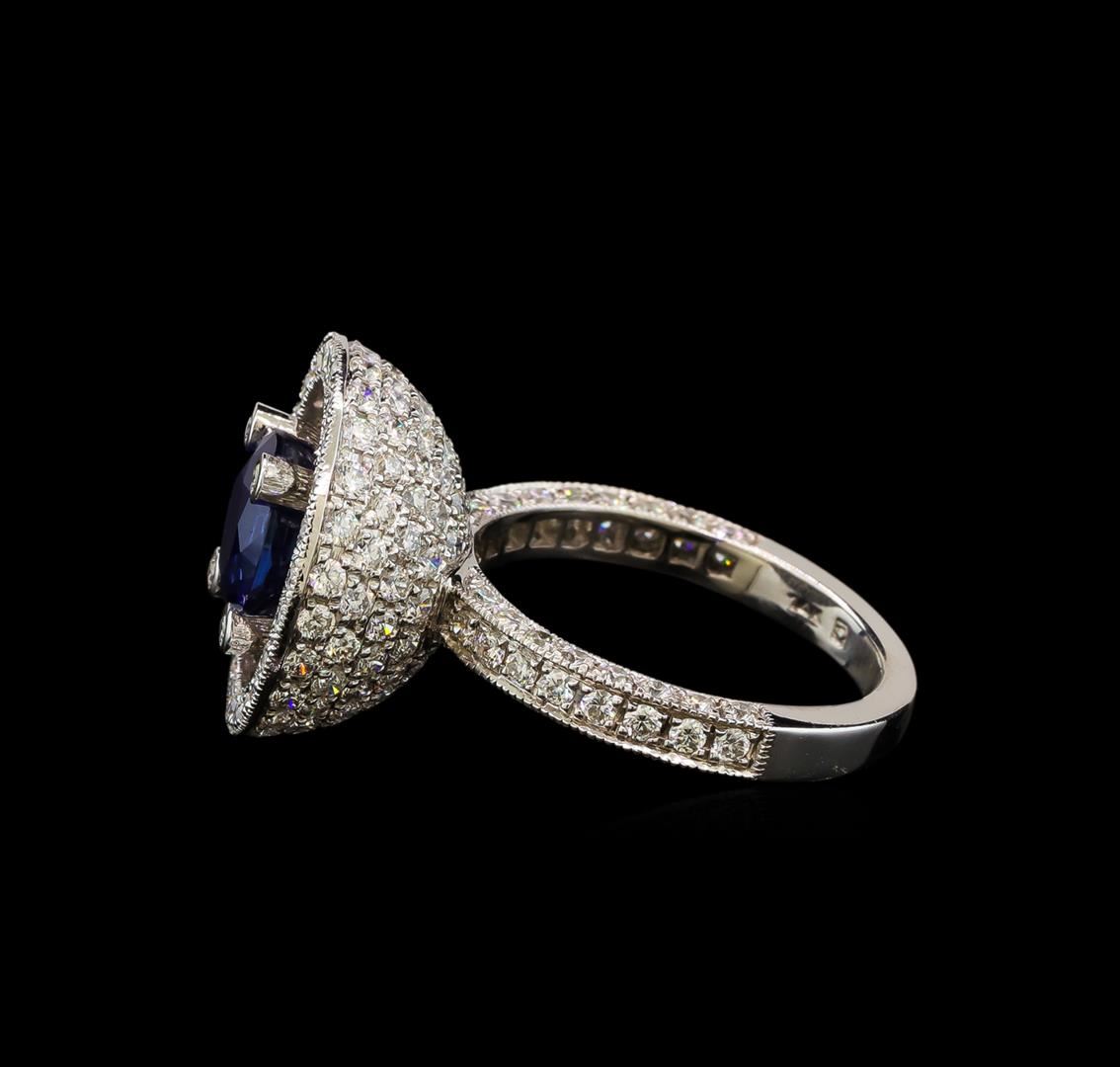 One electronically tested 14KT white gold lady's cast fashion ring with a basket halo with a bright polish with milgrain detailing finish. The featured lady's ring has a shank measuring 2.66 millimeters wide. Identified with markings of '14K'. Condition is new, good workmanship. Containing: One prong set round modified mixed cut natural blue sapphire, measuring 8.61 - 8.55 x 6.01 mm, (depth est.) approximate weight of 3.60ct., clarity is slightly included, medium dark, strong, blue color, (GIA B 6/5), cut is very good. Transmitting light with a minimum of distortion, transparent. Colored gemstones are presumed to have been subjected to commonly used enhancement processes. Graded in the setting. GIA Laboratory Report #217111423. One Hundred Eighty-One prong set round brilliant cut diamonds, measuring 1.65 - 1.55 x 0.99mm (depth est.) approximate total weight of 181 Stones = 2.82ct. Graded in the setting. Clarity VS-2 to SI-2. Color: G - I Cut Good Four bezel set round brilliant cut diamonds, measuring 1.60 - 1.50 x 0.96mm (depth est.) approximate total weight of 4 Stones = 0.06ct. Graded in the setting. Clarity SI-1 to SI-2. Color: G - H Cut Good. Total Weight of Colored Stones 3.60ct.. Total Weight of Diamonds 2.88ct.. Total Weight of Ring 8.60gm. GAS Appraised at $37,430.00.