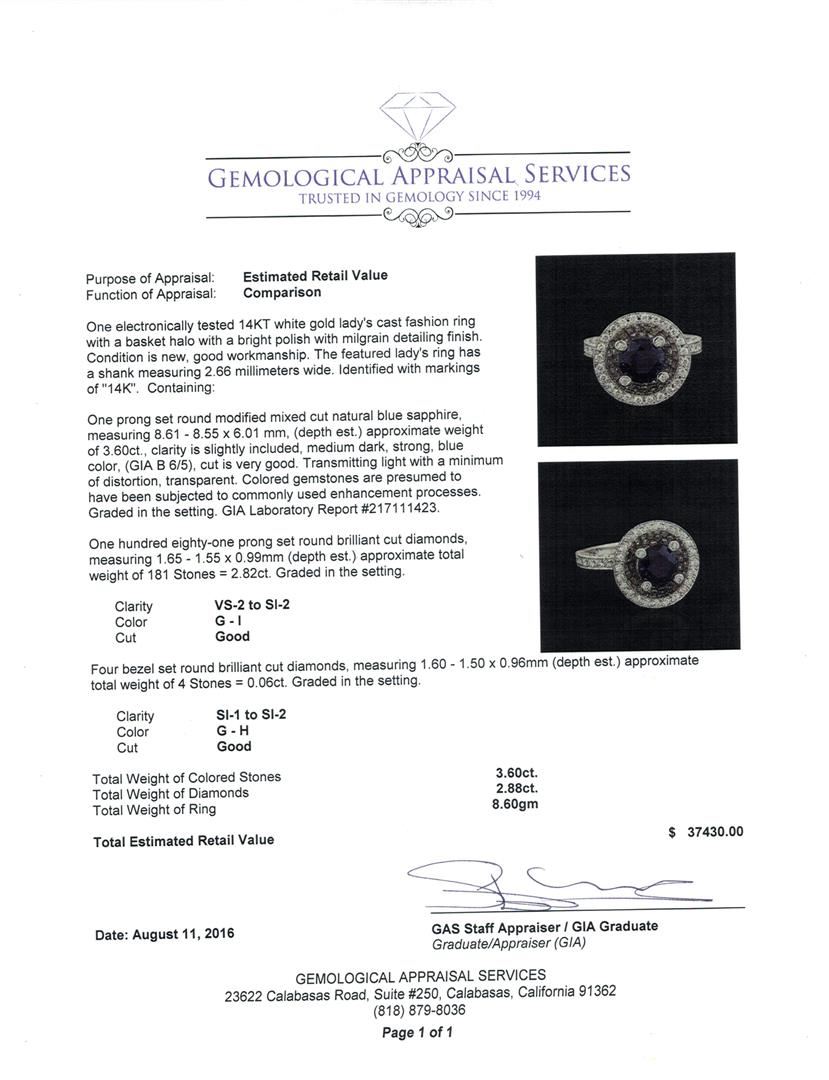 One electronically tested 14KT white gold lady's cast fashion ring with a basket halo with a bright polish with milgrain detailing finish. The featured lady's ring has a shank measuring 2.66 millimeters wide. Identified with markings of '14K'. Condition is new, good workmanship. Containing: One prong set round modified mixed cut natural blue sapphire, measuring 8.61 - 8.55 x 6.01 mm, (depth est.) approximate weight of 3.60ct., clarity is slightly included, medium dark, strong, blue color, (GIA B 6/5), cut is very good. Transmitting light with a minimum of distortion, transparent. Colored gemstones are presumed to have been subjected to commonly used enhancement processes. Graded in the setting. GIA Laboratory Report #217111423. One Hundred Eighty-One prong set round brilliant cut diamonds, measuring 1.65 - 1.55 x 0.99mm (depth est.) approximate total weight of 181 Stones = 2.82ct. Graded in the setting. Clarity VS-2 to SI-2. Color: G - I Cut Good Four bezel set round brilliant cut diamonds, measuring 1.60 - 1.50 x 0.96mm (depth est.) approximate total weight of 4 Stones = 0.06ct. Graded in the setting. Clarity SI-1 to SI-2. Color: G - H Cut Good. Total Weight of Colored Stones 3.60ct.. Total Weight of Diamonds 2.88ct.. Total Weight of Ring 8.60gm. GAS Appraised at $37,430.00.