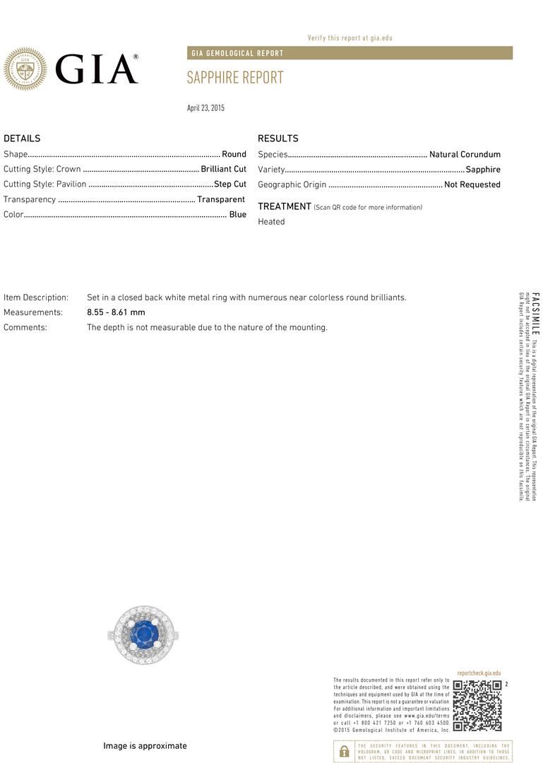 One electronically tested 14KT white gold lady's cast fashion ring with a basket halo with a bright polish with milgrain detailing finish. The featured lady's ring has a shank measuring 2.66 millimeters wide. Identified with markings of '14K'. Condition is new, good workmanship. Containing: One prong set round modified mixed cut natural blue sapphire, measuring 8.61 - 8.55 x 6.01 mm, (depth est.) approximate weight of 3.60ct., clarity is slightly included, medium dark, strong, blue color, (GIA B 6/5), cut is very good. Transmitting light with a minimum of distortion, transparent. Colored gemstones are presumed to have been subjected to commonly used enhancement processes. Graded in the setting. GIA Laboratory Report #217111423. One Hundred Eighty-One prong set round brilliant cut diamonds, measuring 1.65 - 1.55 x 0.99mm (depth est.) approximate total weight of 181 Stones = 2.82ct. Graded in the setting. Clarity VS-2 to SI-2. Color: G - I Cut Good Four bezel set round brilliant cut diamonds, measuring 1.60 - 1.50 x 0.96mm (depth est.) approximate total weight of 4 Stones = 0.06ct. Graded in the setting. Clarity SI-1 to SI-2. Color: G - H Cut Good. Total Weight of Colored Stones 3.60ct.. Total Weight of Diamonds 2.88ct.. Total Weight of Ring 8.60gm. GAS Appraised at $37,430.00.
