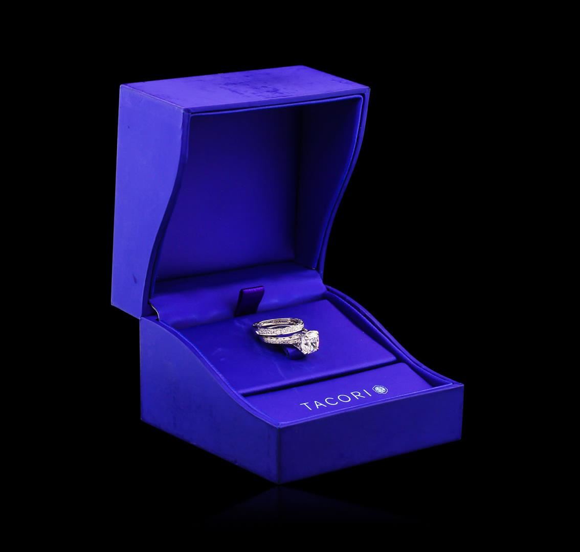 One electronically tested 18KT-platinum white gold lady's combination cast & assembled vintage ring & wedding band with a cathedral shank with a bright polish with milgrain detailing finish. The featured ladies wedding set has the engagement ring made of platinum and the wedding band made of 18K white gold, with a double shank measuring 5.20 millimeters wide. Trademark is Tacori. Identified with markings of "PLAT-18K". Condition is new, good workmanship. Containing: One prong set cushion cut diamond, measuring 8.17 x 8.15 x 5.51mm (depth est.) approximate weight of 3.08ct. Graded loose prior to setting in the GIA Laboratory, Report #5146540983. Graded in the setting. Clarity: VS-2. Color: I. Cut Very Good. Seventeen prong set round brilliant cut diamonds, measuring 1.50 - 1.45 x 0.96mm (depth est.) approximate total weight of 17 Stones = 0.22ct. Graded in the setting. Clarity: VS-1 to VS-2. Color: G - H. Cut Very Good. Sixty-Eight prong set round brilliant cut diamonds, measuring 1.20 - 1.10 x 0.75mm (depth est.) approximate total weight of 68 Stones = 0.45ct. Graded in the setting. Clarity: VS-1 to VS-2. Color: G - H. Cut Very Good. Total Weight of Diamonds 3.75ct. Total Weight of Ring & Wedding Band 8.90gm. GAS Appraised at $84,980.00.