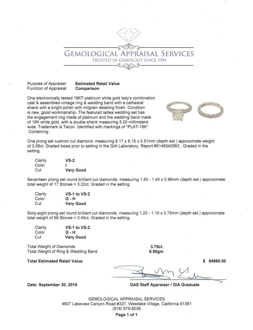 One electronically tested 18KT-platinum white gold lady's combination cast & assembled vintage ring & wedding band with a cathedral shank with a bright polish with milgrain detailing finish. The featured ladies wedding set has the engagement ring made of platinum and the wedding band made of 18K white gold, with a double shank measuring 5.20 millimeters wide. Trademark is Tacori. Identified with markings of "PLAT-18K". Condition is new, good workmanship. Containing: One prong set cushion cut diamond, measuring 8.17 x 8.15 x 5.51mm (depth est.) approximate weight of 3.08ct. Graded loose prior to setting in the GIA Laboratory, Report #5146540983. Graded in the setting. Clarity: VS-2. Color: I. Cut Very Good. Seventeen prong set round brilliant cut diamonds, measuring 1.50 - 1.45 x 0.96mm (depth est.) approximate total weight of 17 Stones = 0.22ct. Graded in the setting. Clarity: VS-1 to VS-2. Color: G - H. Cut Very Good. Sixty-Eight prong set round brilliant cut diamonds, measuring 1.20 - 1.10 x 0.75mm (depth est.) approximate total weight of 68 Stones = 0.45ct. Graded in the setting. Clarity: VS-1 to VS-2. Color: G - H. Cut Very Good. Total Weight of Diamonds 3.75ct. Total Weight of Ring & Wedding Band 8.90gm. GAS Appraised at $84,980.00.
