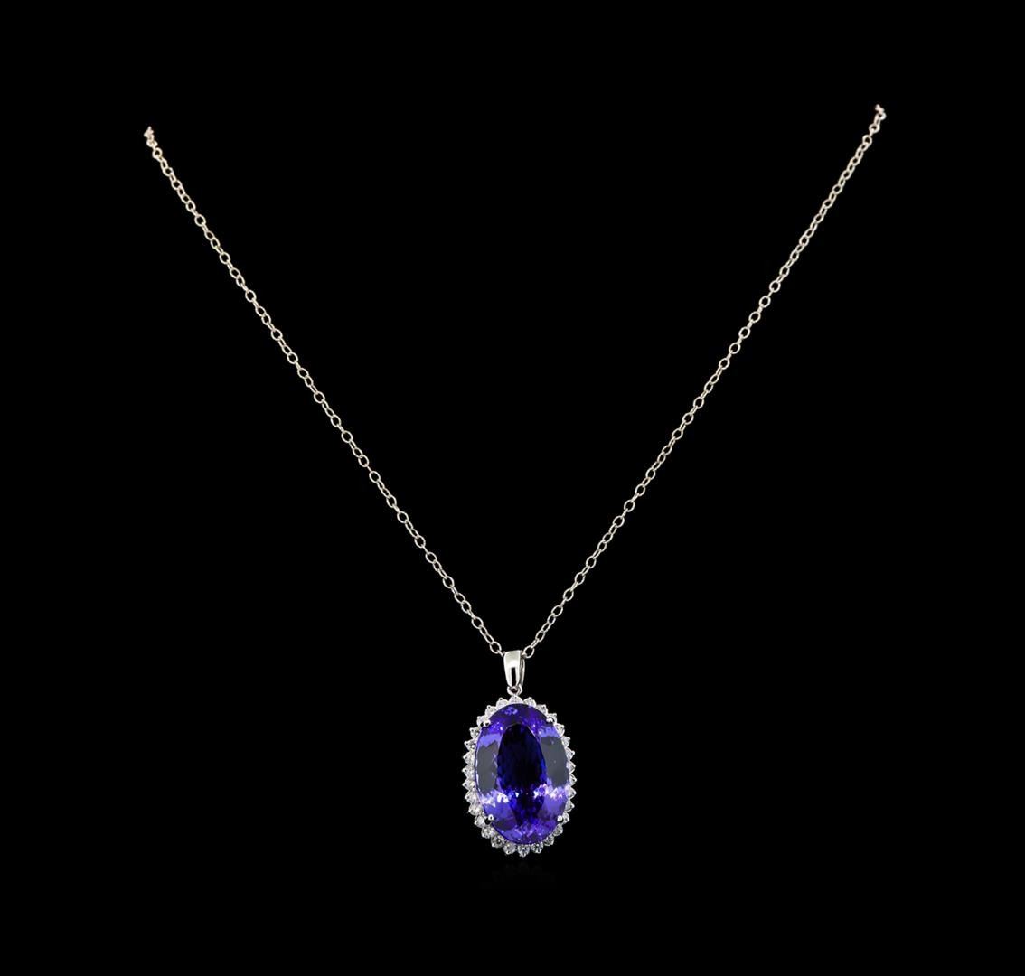 One electronically tested 14KT white gold lady's combination cast & assembled fashion pendant & chain 18.0' long, 2mm twisted oval cable link with a lobster claw clasp with a bright polish finish. Identified with markings of '14K'. Condition is new, good workmanship. Containing: One prong set oval modified brilliant cut natural tanzanite, measuring 24.71 x 16.28 x 10.12mm, (depth est.) 5%. bulge factor, approximate weight of 30.28ct., clarity is eye clean, medium, moderately strong, violet color, (GIA V 5/4), cut is excellent. Transmitting light with no distortion, transparent. Colored gemstones are presumed to have been subjected to commonly used enhancement processes. Graded in the setting. Thirty prong set round brilliant cut diamonds, measuring 2.10 - 2.00 x 1.27mm (depth est.) approximate total weight of 30 Stones = 0.98ct. Graded in the setting. Clarity SI-1 to I-1. Color: G - H Cut Good. Total Weight of Colored Stones 30.28ct.. Total Weight of Diamonds 0.98ct.. Total Weight of Pendant & Chain 12.80gm. GAS Appraised at $38,475.00.