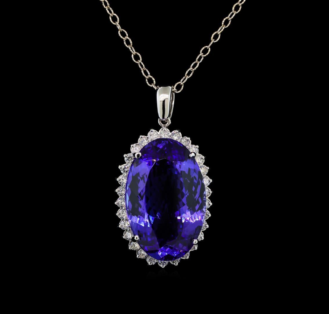 One electronically tested 14KT white gold lady's combination cast & assembled fashion pendant & chain 18.0' long, 2mm twisted oval cable link with a lobster claw clasp with a bright polish finish. Identified with markings of '14K'. Condition is new, good workmanship. Containing: One prong set oval modified brilliant cut natural tanzanite, measuring 24.71 x 16.28 x 10.12mm, (depth est.) 5%. bulge factor, approximate weight of 30.28ct., clarity is eye clean, medium, moderately strong, violet color, (GIA V 5/4), cut is excellent. Transmitting light with no distortion, transparent. Colored gemstones are presumed to have been subjected to commonly used enhancement processes. Graded in the setting. Thirty prong set round brilliant cut diamonds, measuring 2.10 - 2.00 x 1.27mm (depth est.) approximate total weight of 30 Stones = 0.98ct. Graded in the setting. Clarity SI-1 to I-1. Color: G - H Cut Good. Total Weight of Colored Stones 30.28ct.. Total Weight of Diamonds 0.98ct.. Total Weight of Pendant & Chain 12.80gm. GAS Appraised at $38,475.00.