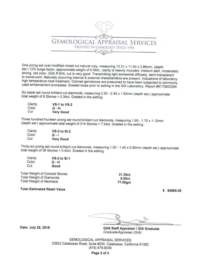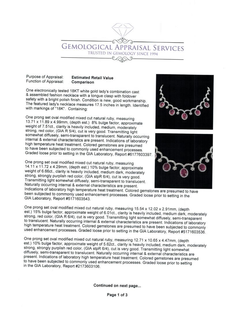 One electronically tested 18KT white gold lady's combination cast & assembled fashion necklace with a tongue clasp with fold over safety with a bright polish finish. The featured lady's necklace measures 17.5 inches in length. Identified with markings of '18K'. Condition is new, good workmanship. Containing: One prong set oval modified mixed cut natural ruby, measuring 13.71 x 11.89 x 4.99mm, (depth est.) 8%. bulge factor, approximate weight of 7.51ct., clarity is heavily included, medium, moderately strong, red color, (GIA R 5/4), cut is very good. Transmitting light somewhat diffusely, semi-transparent to translucent. Naturally occurring internal & external characteristics are present. Indications of laboratory high temperature heat treatment. Colored gemstones are presumed to have been subjected to commonly used enhancement processes. Graded loose prior to setting in the GIA Laboratory, Report #6177603397. One prong set oval modified mixed cut natural ruby, measuring 14.11 x 11.72 x 4.29mm, (depth est.) 10%. bulge factor, approximate weight of 6.66ct., clarity is heavily included, medium dark, moderately strong, strongly purplish red color, (GIA stpR 6/4), cut is very good. Transmitting light somewhat diffusely, semi-transparent to translucent. Naturally occurring internal & external characteristics are present. Indications of laboratory high temperature heat treatment. Colored gemstones are presumed to have been subjected to commonly used enhancement processes. Graded loose prior to setting in the GIA Laboratory, Report #5171603543. One prong set oval modified mixed cut natural ruby, measuring 15.54 x 12.02 x 2.91mm, (depth est.) 15%. bulge factor, approximate weight of 6.01ct., clarity is heavily included, medium dark, moderately strong, red color, (GIA R 6/4), cut is very good. Transmitting light somewhat diffusely, semi-transparent to translucent. Naturally occurring internal & external characteristics are present. Indications of laboratory high temperature heat treatment. Colored gemstones are presumed to have been subjected to commonly used enhancement processes. Graded loose prior to setting in the GIA Laboratory, Report #5171603536. One prong set oval modified mixed cut natural ruby, measuring 12.71 x 10.65 x 4.47mm, (depth est.) 10%. bulge factor, approximate weight of 5.62ct., clarity is heavily included, medium dark, moderately strong, strongly purplish red color, (GIA stpR 6/4), cut is very good. Transmitting light somewhat diffusely, semi-transparent to translucent. Naturally occurring internal & external characteristics are present. Indications of laboratory high temperature heat treatment. Colored gemstones are presumed to have been subjected to commonly used enhancement processes. Graded loose prior to setting in the GIA Laboratory, Report #2173603106. One prong set oval modified mixed cut natural ruby, measuring 13.31 x 11.50 x 3.86mm, (depth est.) 12%. bulge factor, approximate weight of 5.59ct., clarity is heavily included, medium dark, moderately strong, red color, (GIA R 6/4), cut is very good. Transmitting light somewhat diffusely, semi-transparent to translucent. Naturally occurring internal & external characteristics are present. Indications of laboratory high temperature heat treatment. Colored gemstones are presumed to have been subjected to commonly used enhancement processes. Graded loose prior to setting in the GIA Laboratory, Report #6173603394. Six bezel set round brilliant cut diamonds, measuring 2.50 - 2.40 x 1.52mm (depth est.) approximate total weight of 6 Stones = 0.34ct. Graded in the setting. Clarity VS-1 to VS-2. Color: G - H Cut Very Good Three Hundred Fourteen prong set round brilliant cut diamonds, measuring 1.90 - 1.70 x 1.12mm (depth est.) approximate total weight of 314 Stones = 7.24ct. Graded in the setting. Clarity VS-2 to SI-2. Color: G - I Cut Very Good Thirty-Six prong set round brilliant cut diamonds, measuring 1.50 - 1.40 x 0.90mm (depth est.) approximate total weight of 36 Stones = 0.42ct. Graded in the setting. Clarity VS-2 to SI-1. Color: G - H Cut Good. Total Weight of Colored Stones 31.39ct.. Total Weight of Diamonds 8.00ct.. Total Weight of Necklace 77.00gm. GAS Appraised at $85,965.00.