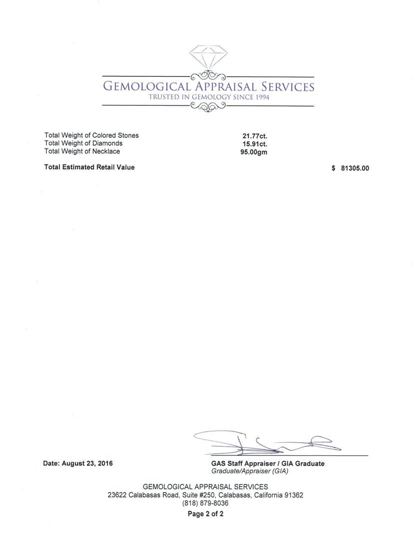 One electronically tested 14-18KT white gold necklace and earring jewelry suite. Condition is new, good workmanship. The necklace contains one GIA certified prong set pear modified brilliant cut natural tanzanite, measuring 20.32 x 14.33 x 9.94mm, approximate weight of 17.75ct. One prong set pear modified brilliant cut natural tanzanite, measuring 14.00 x 8.07 x 5.48mm, approximate total weight of 4.02ct. Total Weight of Diamonds on necklace: 15.91ct. Total Weight of Necklace: 96.00 grams. The pair of earrings contains two prong set modified brilliant cut natural tanzanites, measuring 11.10 x 7.30 x 5.70mm, approximate total weight of 5.62ct. Six prong set pear modified brilliant cut natural tanzanites, measuring 7.60 x 5.00 x 2.90mm, approximate total weight of 4.61ct. Four prong set pear modified brilliant cut natural tanzanites, measuring 6.15 x 4.05 x 2.75mm, approximate total weight of 1.80ct. Total Weight of Diamonds on earrings: 4.70ct. Total Weight of Earrings: 25.50 grams. See appraisals for more info. GAS Appraised at $106,185.00.
