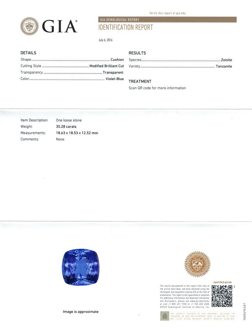 One electronically tested 14KT white gold lady's cast fashion pendant & chain 18.0' long, 2mm twisted oval cable link with a lobster claw clasp with a double basket halo with a bright polish finish. Identified with markings of 'K14'. Condition is new, good workmanship. Containing: One prong set square cushion modified brilliant cut natural tanzanite, measuring 18.63 x 18.53 x 12.52mm, (depth est.) 4%. bulge factor, approximate weight of 35.28ct., clarity is eye clean, medium dark, moderately strong, violetish blue color, (GIA vB 6/4), cut is excellent. Transmitting light with no distortion, transparent. Colored gemstones are presumed to have been subjected to commonly used enhancement processes. Graded loose prior to setting in the GIA Laboratory, Report #5171668651. Thirty-Two prong set round brilliant cut diamonds, measuring 2.20 - 2.15 x 1.35mm (depth est.) approximate total weight of 32 Stones = 1.28ct. Graded in the setting. Clarity SI-1 to I-1. Color: H - I Cut Good Thirty-Two prong set round brilliant cut diamonds, measuring 2.10 - 2.00 x 1.27mm (depth est.) approximate total weight of 32 Stones = 1.04ct. Graded in the setting. Clarity SI-1 to I-1. Color: H - I Cut Good. Total Weight of Colored Stones 35.28ct.. Total Weight of Diamonds 2.32ct.. Total Weight of Pendant & Chain 20.50gm. GAS Appraised at $53,950.00.