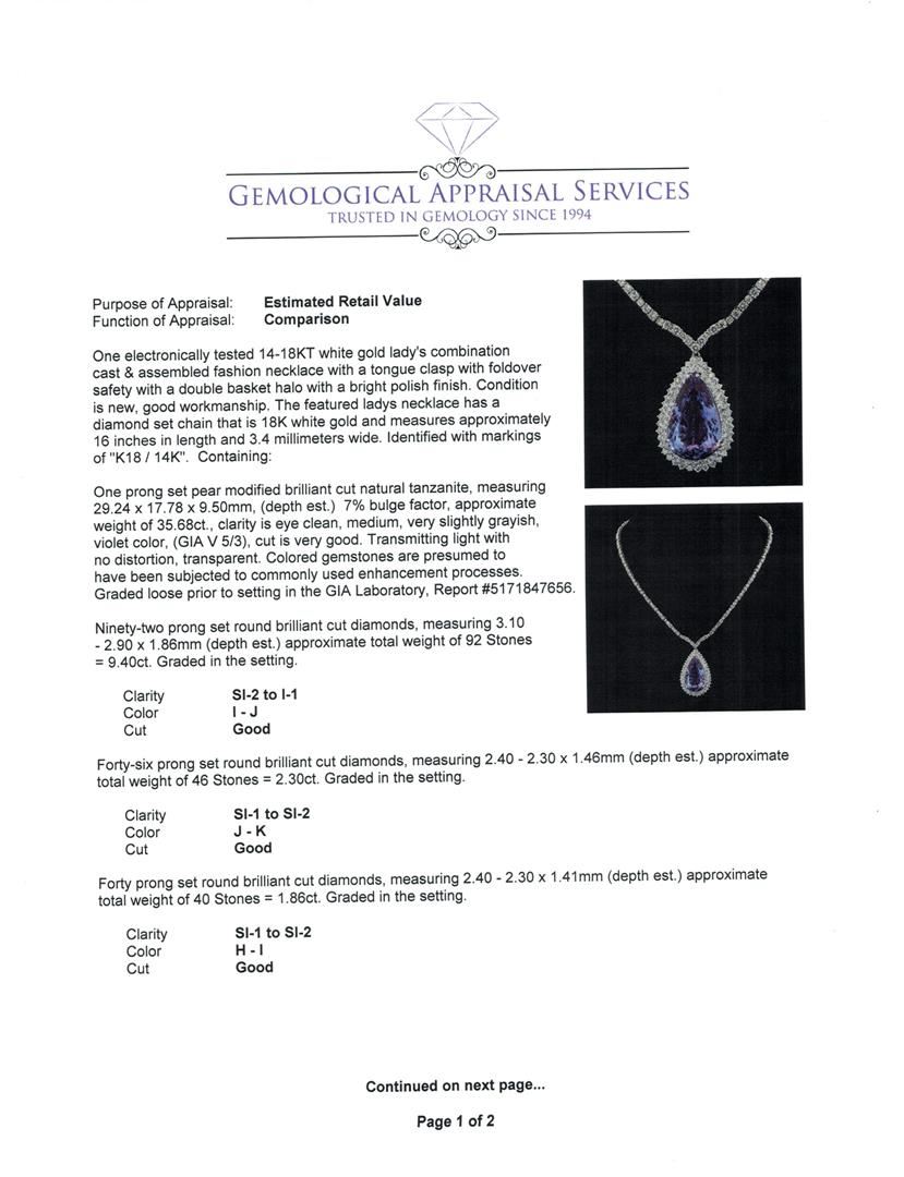 One electronically tested 14-18KT white gold lady's combination cast & assembled fashion necklace with a tongue clasp with foldover safety with a double basket halo with a bright polish finish. The featured ladys necklace has a diamond set chain that is 18K white gold and measures approximately 16 inches in length and 3.4 millimeters wide. Identified with markings of 'K18 / 14K'. Condition is new, good workmanship. Containing: One prong set pear modified brilliant cut natural tanzanite, measuring 29.24 x 17.78 x 9.50mm, (depth est.) 7%. bulge factor, approximate weight of 35.68ct., clarity is eye clean, medium, very slightly grayish, violet color, (GIA V 5/3), cut is very good. Transmitting light with no distortion, transparent. Colored gemstones are presumed to have been subjected to commonly used enhancement processes. Graded loose prior to setting in the GIA Laboratory, Report #5171847656. Ninety-Two prong set round brilliant cut diamonds, measuring 3.10 - 2.90 x 1.86mm (depth est.) approximate total weight of 92 Stones = 9.40ct. Graded in the setting. Clarity SI-2 to I-1. Color: I - J Cut Good Forty-Six prong set round brilliant cut diamonds, measuring 2.40 - 2.30 x 1.46mm (depth est.) approximate total weight of 46 Stones = 2.30ct. Graded in the setting. Clarity SI-1 to SI-2. Color: J - K Cut Good Forty prong set round brilliant cut diamonds, measuring 2.40 - 2.30 x 1.41mm (depth est.) approximate total weight of 40 Stones = 1.86ct. Graded in the setting. Clarity SI-1 to SI-2. Color: H - I Cut Good Thirty-Eight prong set round brilliant cut diamonds, measuring 2.10 - 2.00 x 1.23mm (depth est.) approximate total weight of 38 Stones = 1.14ct. Graded in the setting. Clarity SI-1 to SI-2. Color: G - H Cut Good. Total Weight of Colored Stones 35.68ct.. Total Weight of Diamonds 14.70ct.. Total Weight of Necklace 38.90gm. GAS Appraised at $61,030.00.