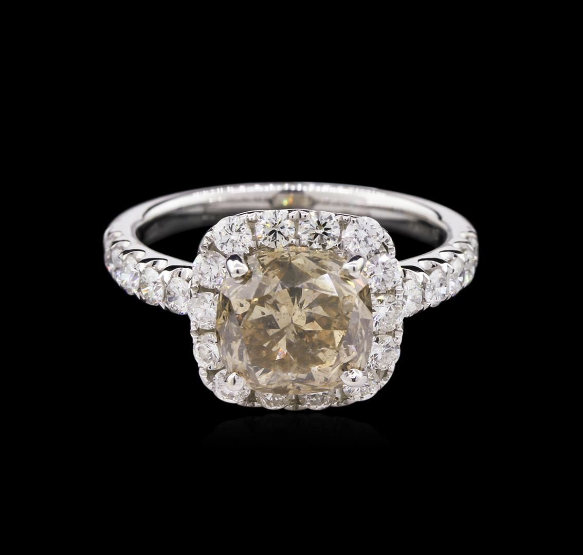One electronically tested 18KT white gold ladies cast diamond ring with a bright polish finish. Condition is new, good workmanship. The featured diamond is set within a diamond bezel supported by diamond set shoulders, completed by a two millimeter wide band. Trademark is Hana. Identified with markings of "18K". Containing: One prong set cushion cut diamond, measuring 8.38 x 7.98 x 6.06mm exact weight 3.14ct. GIA Colored Diamond Report attached. Graded loose for color prior to setting in the GIA Laboratory. Clarity: I-1. Color: Fancy Yellowish Brown. Depth: 76.0%. Table: 63.0%. Twenty-four prong set round brilliant cut diamonds approximate total weight of 24 Stones = 0.87ct. Graded in the setting. Clarity: SI-1 to SI-2. Color: G-H. Total Weight od Diamonds 4.01ct. Total Weight of Ring 4.63 grams. AIG Appraised at $30,340.00.
