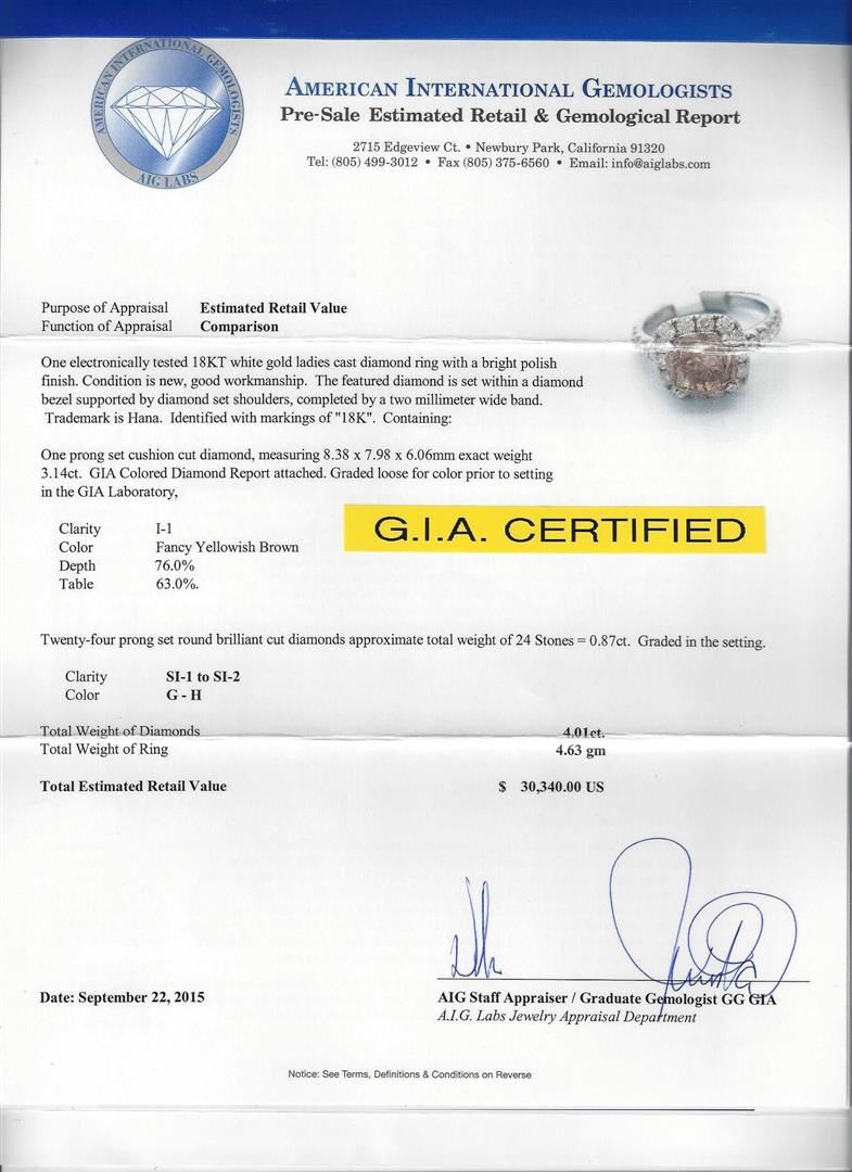 One electronically tested 18KT white gold ladies cast diamond ring with a bright polish finish. Condition is new, good workmanship. The featured diamond is set within a diamond bezel supported by diamond set shoulders, completed by a two millimeter wide band. Trademark is Hana. Identified with markings of "18K". Containing: One prong set cushion cut diamond, measuring 8.38 x 7.98 x 6.06mm exact weight 3.14ct. GIA Colored Diamond Report attached. Graded loose for color prior to setting in the GIA Laboratory. Clarity: I-1. Color: Fancy Yellowish Brown. Depth: 76.0%. Table: 63.0%. Twenty-four prong set round brilliant cut diamonds approximate total weight of 24 Stones = 0.87ct. Graded in the setting. Clarity: SI-1 to SI-2. Color: G-H. Total Weight od Diamonds 4.01ct. Total Weight of Ring 4.63 grams. AIG Appraised at $30,340.00.