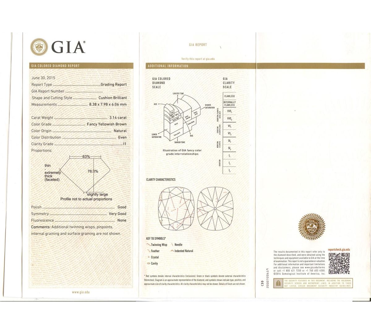 One electronically tested 18KT white gold ladies cast diamond ring with a bright polish finish. Condition is new, good workmanship. The featured diamond is set within a diamond bezel supported by diamond set shoulders, completed by a two millimeter wide band. Trademark is Hana. Identified with markings of "18K". Containing: One prong set cushion cut diamond, measuring 8.38 x 7.98 x 6.06mm exact weight 3.14ct. GIA Colored Diamond Report attached. Graded loose for color prior to setting in the GIA Laboratory. Clarity: I-1. Color: Fancy Yellowish Brown. Depth: 76.0%. Table: 63.0%. Twenty-four prong set round brilliant cut diamonds approximate total weight of 24 Stones = 0.87ct. Graded in the setting. Clarity: SI-1 to SI-2. Color: G-H. Total Weight od Diamonds 4.01ct. Total Weight of Ring 4.63 grams. AIG Appraised at $30,340.00.