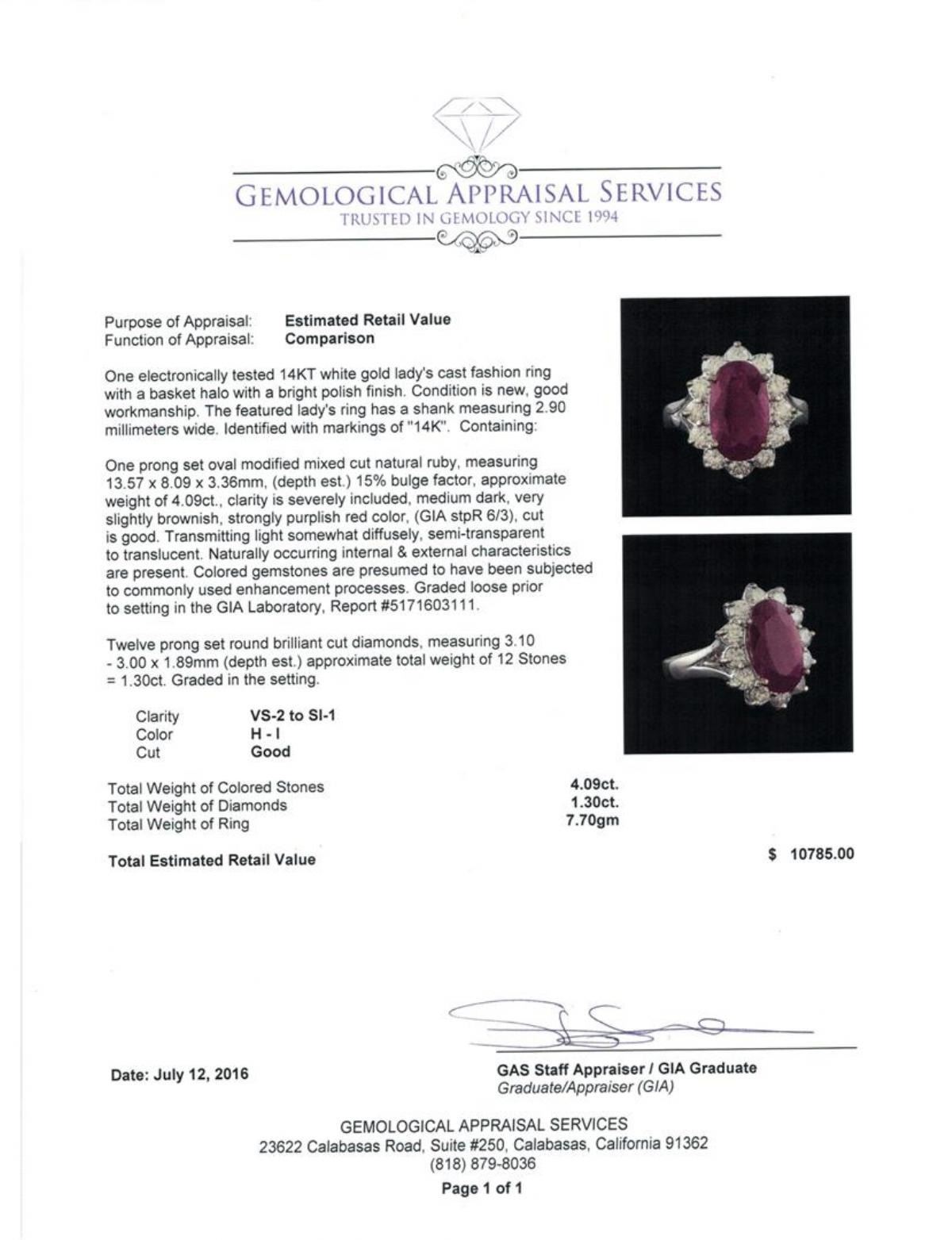 One electronically tested 14KT white gold lady's cast fashion ring with a basket halo with a bright polish finish. The featured lady's ring has a shank measuring 2.90 millimeters wide. Identified with markings of '14K'. Condition is new, good workmanship. Containing: One prong set oval modified mixed cut natural ruby, measuring 13.57 x 8.09 x 3.36mm, (depth est.) 15%. bulge factor, approximate weight of 4.09ct., clarity is severely included, medium dark, very slightly brownish, strongly purplish red color, (GIA stpR 6/3), cut is good. Transmitting light somewhat diffusely, semi-transparent to translucent. Naturally occurring internal & external characteristics are present. Colored gemstones are presumed to have been subjected to commonly used enhancement processes. Graded loose prior to setting in the GIA Laboratory, Report #5171603111. Twelve prong set round brilliant cut diamonds, measuring 3.10 - 3.00 x 1.89mm (depth est.) approximate total weight of 12 Stones = 1.30 ct. Graded in the setting. Clarity VS-2 to SI-1. Color: H - I Cut Good. Total Weight of Colored Stones 4.09ct.. Total Weight of Diamonds 1.30 ct.. Total Weight of Ring 7.70gm. GAS Appraised.