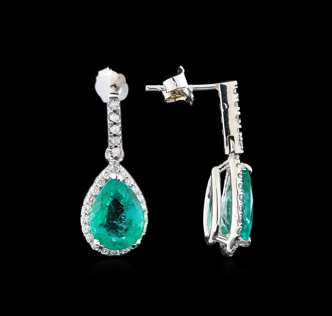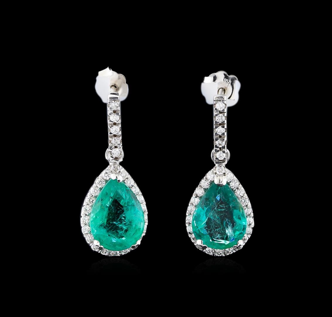 One pair electronically tested 14KT white gold lady's combination cast & assembled fashion earrings with friction posts with a bright polish finish. Identified with markings of "14K". Condition is new, good workmanship. Containing: One prong set pear standard mixed cut natural emerald, measuring 11.01 x 8.03 x 5.54mm, 9%. bulge factor, approximate weight of 2.89ct., clarity is slightly included, type III, medium, very slightly grayish, green color, (GIA G 5/3), cut is very good. Transmitting light with a minimum of distortion, transparent. Naturally occurring internal & external characteristics are present. Clarity enhanced. Graded loose prior to setting in the GIA Laboratory, Report #5172501831.One prong set pear standard mixed cut natural emerald, measuring 10.92 x 8.10 x 3.82mm, approximate weight of 1.86ct., clarity is slightly included, type III, medium, very slightly grayish, green color, (GIA G 5/3), cut is very good. Transmitting light with a minimum of distortion, transparent. Naturally occurring internal & external characteristics are present. Clarity enhanced. Graded loose prior to setting in the GIA Laboratory, Report #5172501834.Fifty-Four prong set round brilliant cut diamonds, measuring 1.40 - 1.30 x 0.84mm (depth est.) approximate total weight of 54 Stones = 0.50ct. Graded in the setting. Clarity: SI-1 to I-1. Color: G - H. Cut Good. Total Weight of Colored Stones 4.75ct. Total Weight of Diamonds 0.50ct. Total Weight of Earrings 4.60gm. GAS Appraised at $5,580.00.