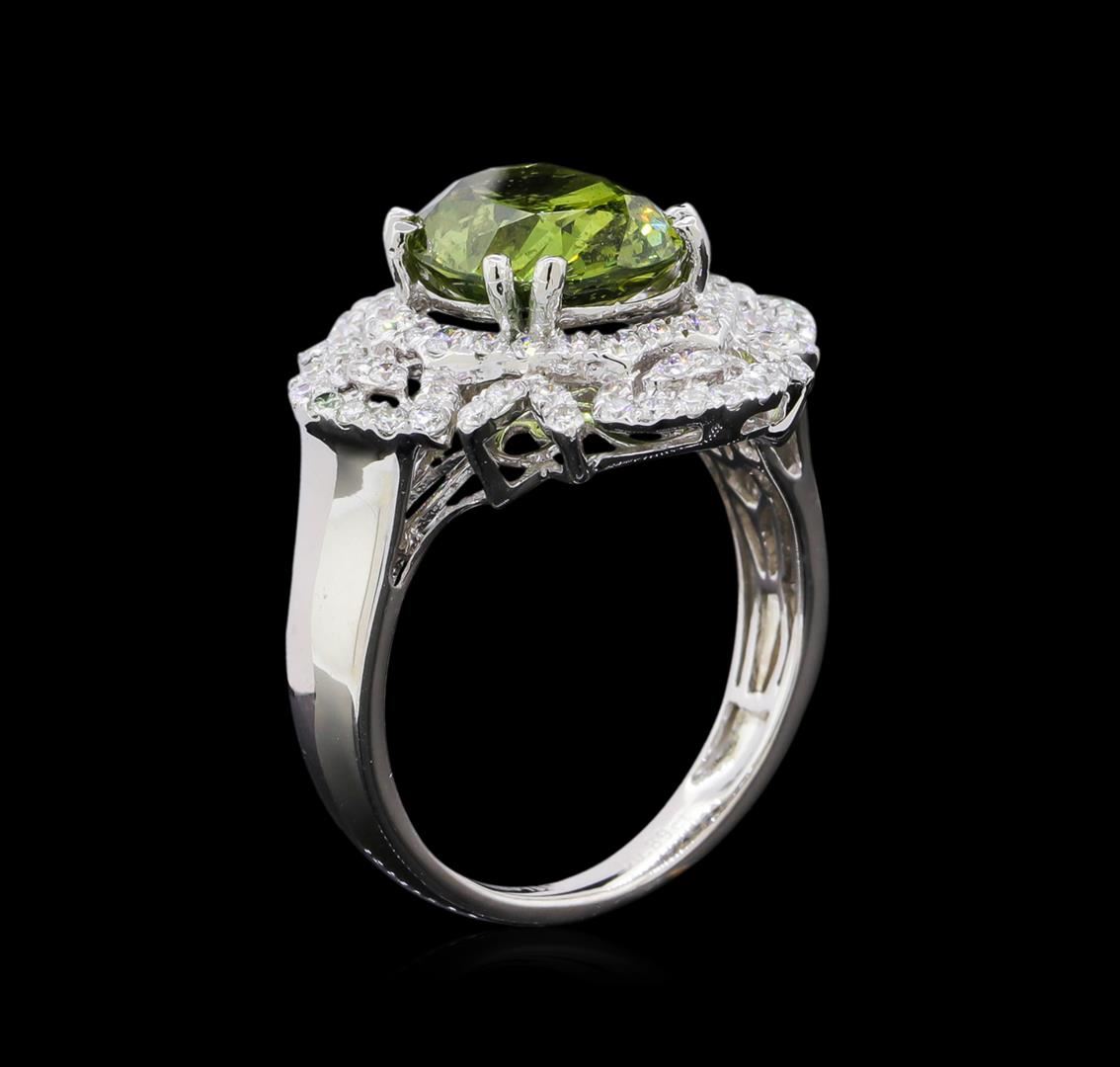 One electronically tested platinum ladies cast green sapphire and diamond ring with a bright polish finish. The featured green sapphire is set within a stylized diamond lattice gallery, completed by a two and one-half millimeter wide band. Trademark is Orianne. Identified with markings of "PT950". Condition is new, good workmanship. Containing: One prong set oval mixed cut natural green sapphire, measuring 11.12 x 8.88 x 5.47mm, exact weight 4.88ct., clarity is slightly included, type II, medium dark, very slightly grayish, yellowish green color, (GIA yG 6/3), cut is good. Transmitting light with a minimum of distortion, transparent. Naturally occurring internal & external characteristics are present. No indications of heating. GIA Gemological Report attached. Graded loose prior to setting in the GIA Laboratory, Report #2175486236.Eighty-Four prong set round brilliant cut diamonds approximate total weight of 84 Stones = 0.89ct. Graded in the setting. Clarity: VS-1 to VS-2. Color: D - E. Total Weight of Colored Stones 4.88ct. Total Weight of Diamonds 0.89ct. Total Weight of Ring 8.82gm. AIG Appraised at $28,925.00.