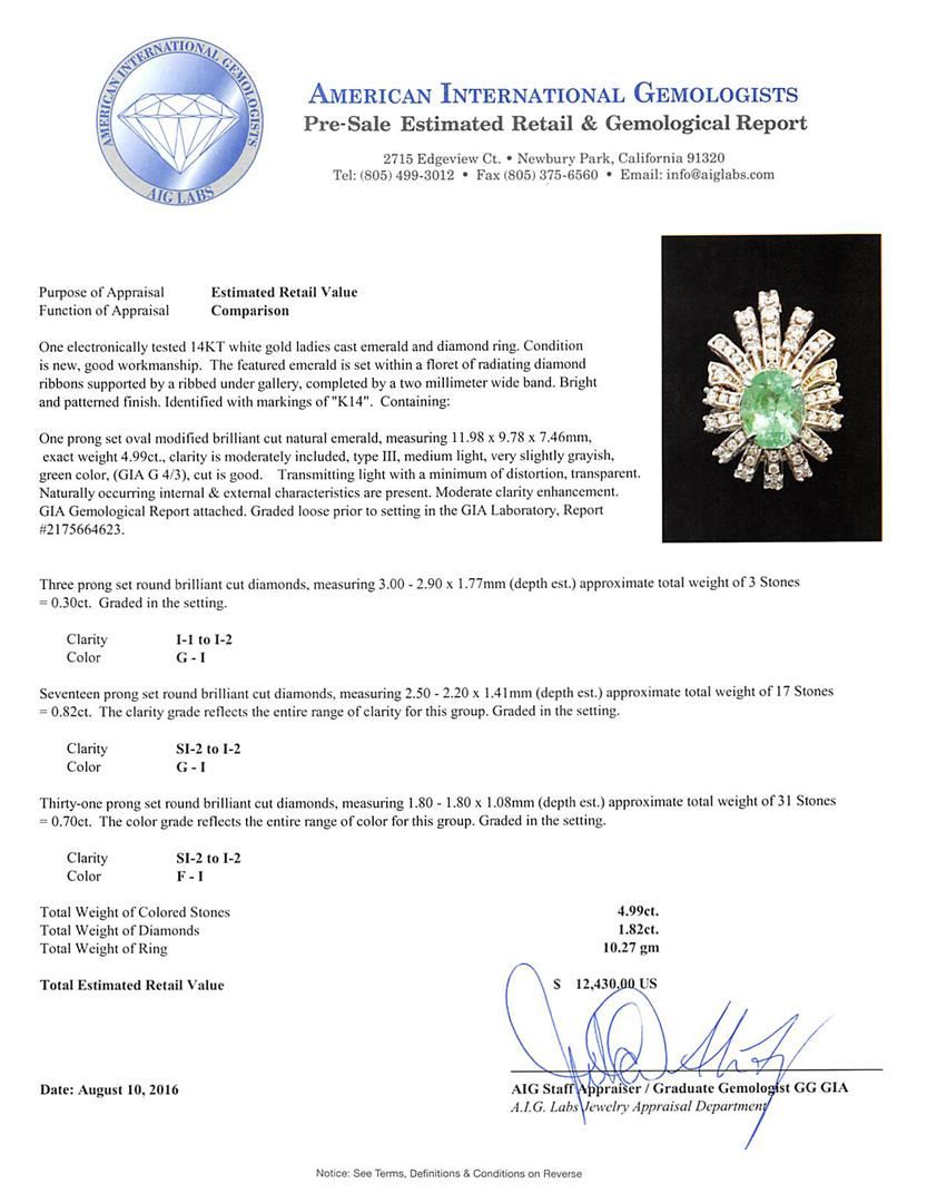 One electronically tested 14KT white gold ladies cast emerald and diamond ring. The featured emerald is set within a floret of radiating diamond ribbons supported by a ribbed under gallery, completed by a two millimeter wide band. Bright and patterned finish. Identified with markings of 'K14'. Condition is new, good workmanship. Containing: One prong set oval modified brilliant cut natural emerald, measuring 11.98 x 9.78 x 7.46mm, exact weight 4.99ct., clarity is moderately included, type III, medium light, very slightly grayish, green color, (GIA G 4/3), cut is good. Transmitting light with a minimum of distortion, transparent. Naturally occurring internal & external characteristics are present. Moderate clarity enhancement. GIA Gemological Report attached. Graded loose prior to setting in the GIA Laboratory, Report #2175664623. Three prong set round brilliant cut diamonds, measuring 3.00 - 2.90 x 1.77mm (depth est.) approximate total weight of 3 Stones = 0.30ct. Graded in the setting. Clarity I-1 to I-2. Color: G - I Seventeen prong set round brilliant cut diamonds, measuring 2.50 - 2.20 x 1.41mm (depth est.) approximate total weight of 17 Stones = 0.82ct. The clarity grade reflects the entire range of clarity for this group. Graded in the setting. Clarity SI-2 to I-2. Color: G - I Thirty-One prong set round brilliant cut diamonds, measuring 1.80 - 1.80 x 1.08mm (depth est.) approximate total weight of 31 Stones = 0.70ct. The color grade reflects the entire range of color for this group. Graded in the setting. Clarity SI-2 to I-2. Color: F - I. Total Weight of Colored Stones 4.99ct.. Total Weight of Diamonds 1.82ct.. Total Weight of Ring 10.27gm. AIG Appraised at $12,430.00.