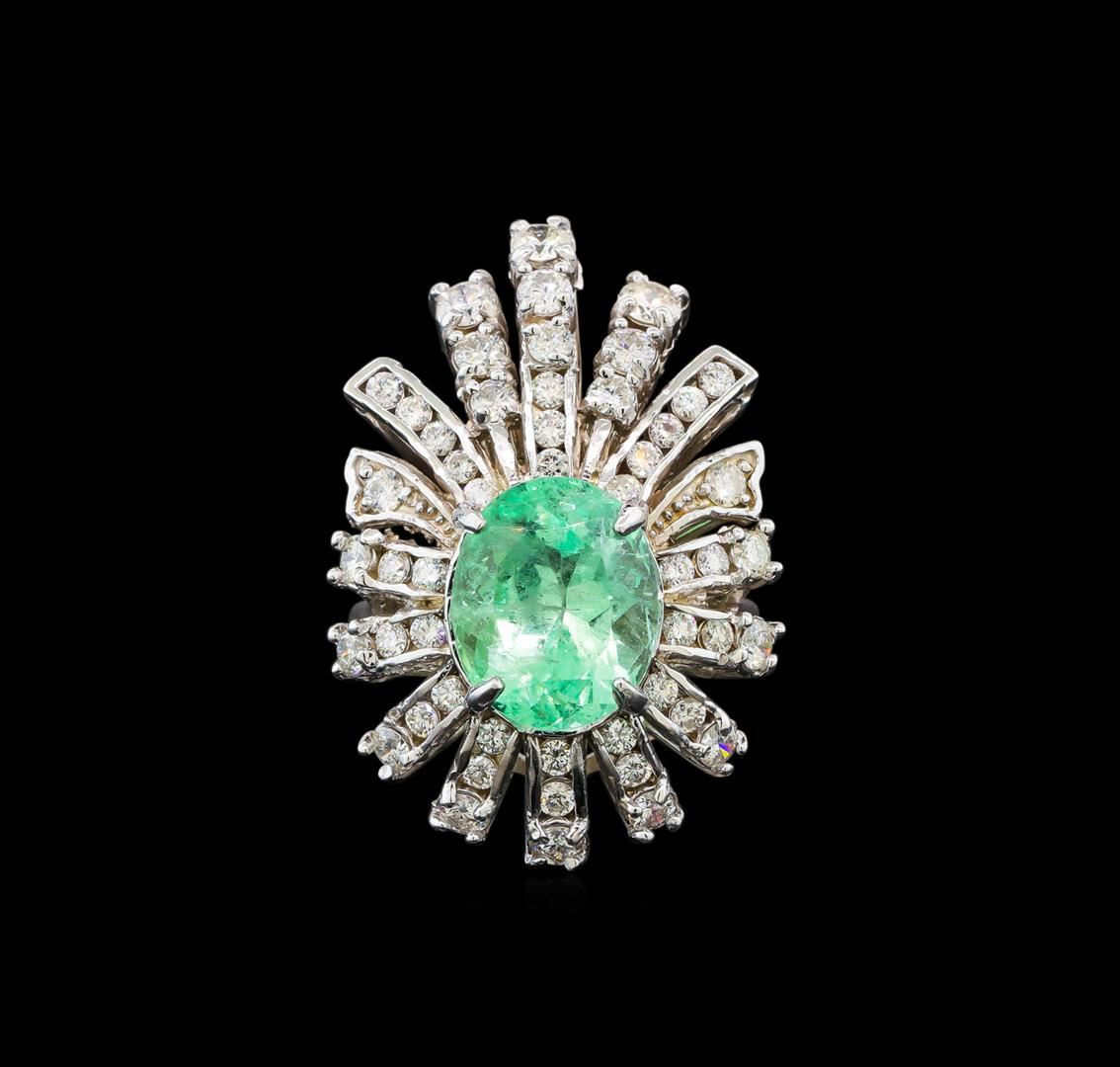 One electronically tested 14KT white gold ladies cast emerald and diamond ring. The featured emerald is set within a floret of radiating diamond ribbons supported by a ribbed under gallery, completed by a two millimeter wide band. Bright and patterned finish. Identified with markings of 'K14'. Condition is new, good workmanship. Containing: One prong set oval modified brilliant cut natural emerald, measuring 11.98 x 9.78 x 7.46mm, exact weight 4.99ct., clarity is moderately included, type III, medium light, very slightly grayish, green color, (GIA G 4/3), cut is good. Transmitting light with a minimum of distortion, transparent. Naturally occurring internal & external characteristics are present. Moderate clarity enhancement. GIA Gemological Report attached. Graded loose prior to setting in the GIA Laboratory, Report #2175664623. Three prong set round brilliant cut diamonds, measuring 3.00 - 2.90 x 1.77mm (depth est.) approximate total weight of 3 Stones = 0.30ct. Graded in the setting. Clarity I-1 to I-2. Color: G - I Seventeen prong set round brilliant cut diamonds, measuring 2.50 - 2.20 x 1.41mm (depth est.) approximate total weight of 17 Stones = 0.82ct. The clarity grade reflects the entire range of clarity for this group. Graded in the setting. Clarity SI-2 to I-2. Color: G - I Thirty-One prong set round brilliant cut diamonds, measuring 1.80 - 1.80 x 1.08mm (depth est.) approximate total weight of 31 Stones = 0.70ct. The color grade reflects the entire range of color for this group. Graded in the setting. Clarity SI-2 to I-2. Color: F - I. Total Weight of Colored Stones 4.99ct.. Total Weight of Diamonds 1.82ct.. Total Weight of Ring 10.27gm. AIG Appraised at $12,430.00.