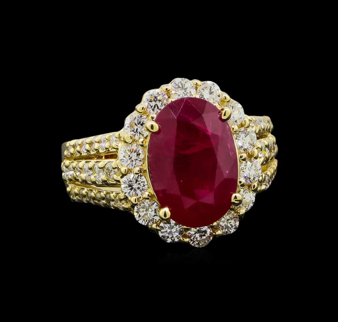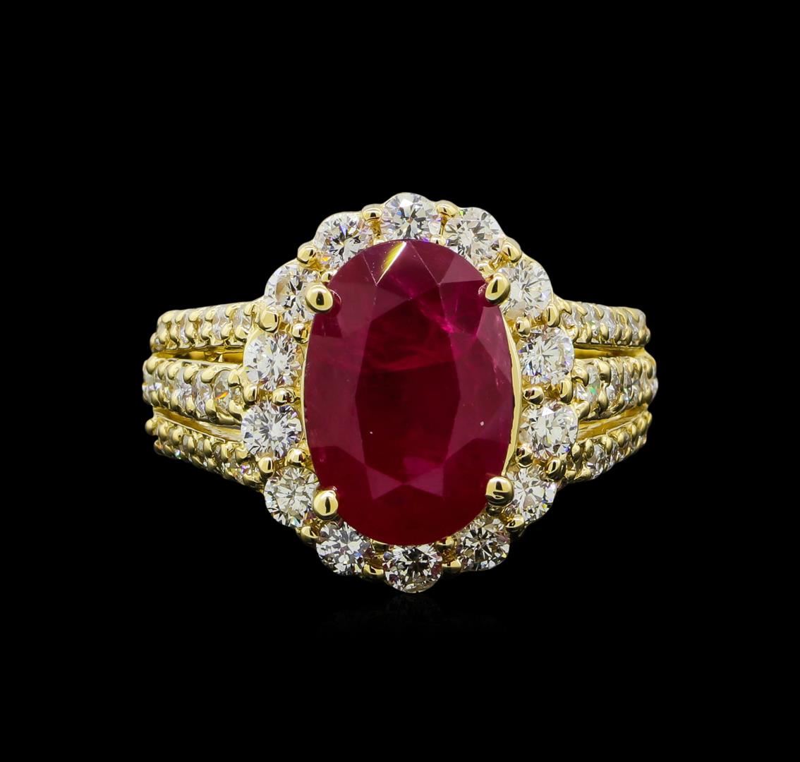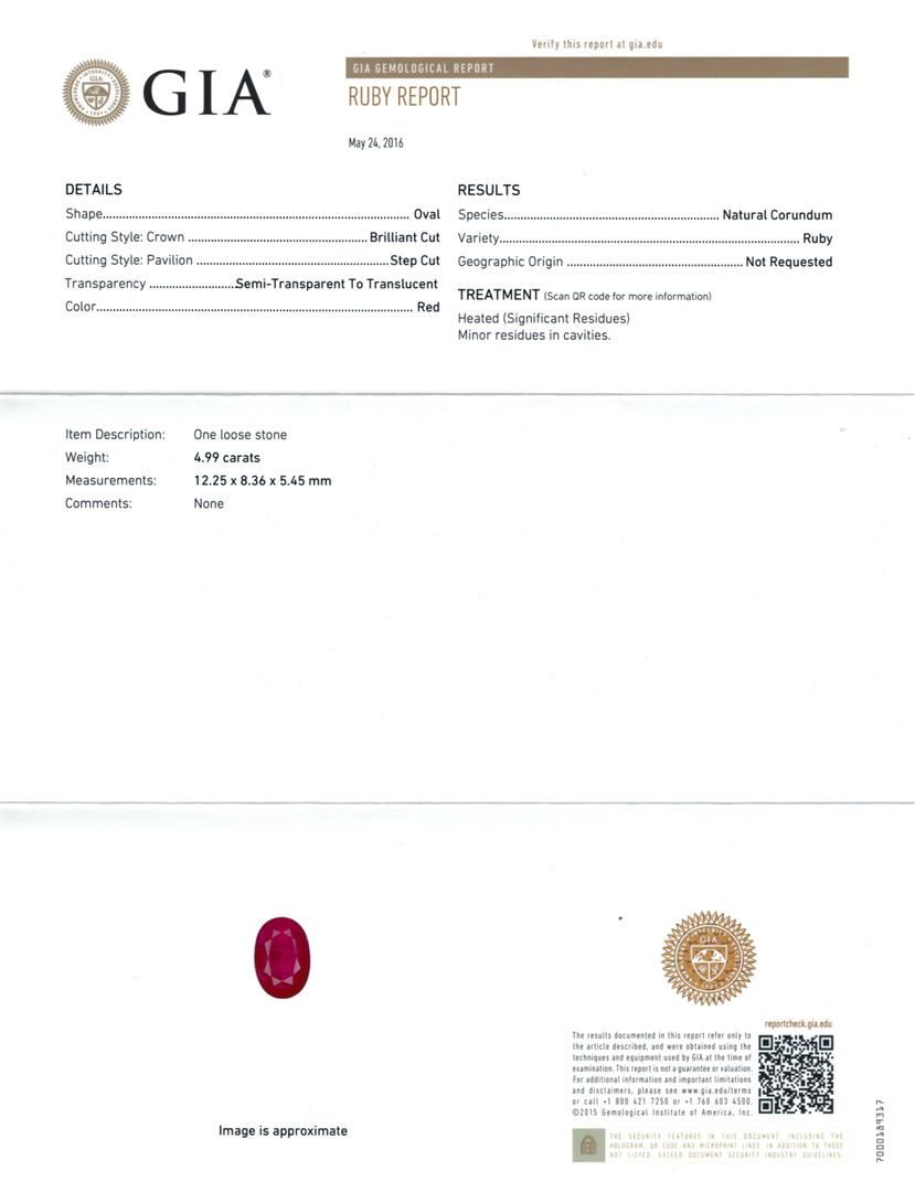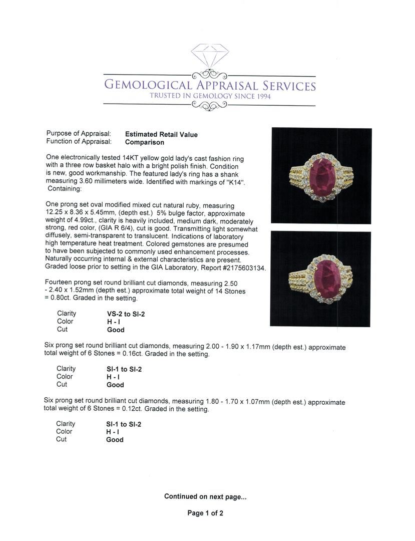 One electronically tested 14KT yellow gold lady's cast fashion ring with a three row basket halo with a bright polish finish. The featured lady's ring has a shank measuring 3.60 millimeters wide. Identified with markings of 'K14'. Condition is new, good workmanship. Containing: One prong set oval modified mixed cut natural ruby, measuring 12.25 x 8.36 x 5.45mm, (depth est.) 5%. bulge factor, approximate weight of 4.99ct., clarity is heavily included, medium dark, moderately strong, red color, (GIA R 6/4), cut is good. Transmitting light somewhat diffusely, semi-transparent to translucent. Indications of laboratory high temperature heat treatment. Colored gemstones are presumed to have been subjected to commonly used enhancement processes. Naturally occurring internal & external characteristics are present. Graded loose prior to setting in the GIA Laboratory, Report #2175603134. Fourteen prong set round brilliant cut diamonds, measuring 2.50 - 2.40 x 1.52mm (depth est.) approximate total weight of 14 Stones = 0.80ct. Graded in the setting. Clarity VS-2 to SI-2. Color: H - I Cut Good Six prong set round brilliant cut diamonds, measuring 2.00 - 1.90 x 1.17mm (depth est.) approximate total weight of 6 Stones = 0.16ct. Graded in the setting. Clarity SI-1 to SI-2. Color: H - I Cut Good Six prong set round brilliant cut diamonds, measuring 1.80 - 1.70 x 1.07mm (depth est.) approximate total weight of 6 Stones = 0.12ct. Graded in the setting. Clarity SI-1 to SI-2. Color: H - I Cut Good Twenty-Four prong set round brilliant cut diamonds, measuring 1.55 - 1.45 x 0.92mm (depth est.) approximate total weight of 24 Stones = 0.30ct. Graded in the setting. Clarity SI-1 to SI-2. Color: H - I Cut Good. Total Weight of Colored Stones 4.99ct.. Total Weight of Diamonds 1.38ct.. Total Weight of Ring 8.00gm. GAS Appraised at $13,035.00.