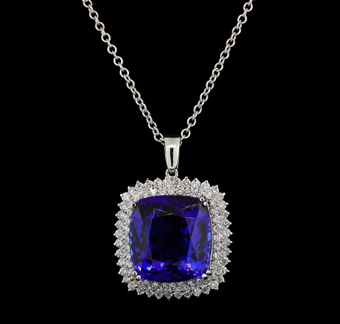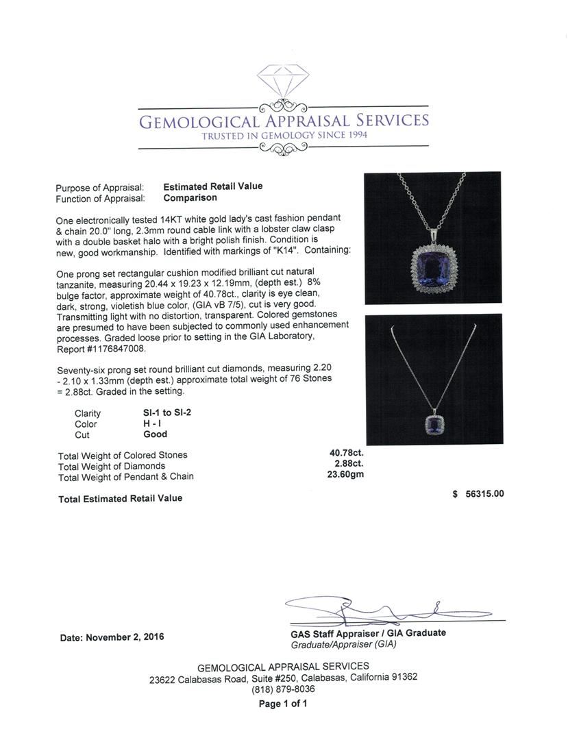 One electronically tested 14KT white gold lady's cast fashion pendant & chain 20.0' long, 2.3mm round cable link with a lobster claw clasp with a double basket halo with a bright polish finish. Identified with markings of 'K14'. Condition is new, good workmanship. Containing: One prong set rectangular cushion modified brilliant cut natural tanzanite, measuring 20.44 x 19.23 x 12.19mm, (depth est.) 8%. bulge factor, approximate weight of 40.78ct., clarity is eye clean, dark, strong, violetish blue color, (GIA vB 7/5), cut is very good. Transmitting light with no distortion, transparent. Colored gemstones are presumed to have been subjected to commonly used enhancement processes. Graded loose prior to setting in the GIA Laboratory, Report #1176847008. Seventy-Six prong set round brilliant cut diamonds, measuring 2.20 - 2.10 x 1.33mm (depth est.) approximate total weight of 76 Stones = 2.88ct. Graded in the setting. Clarity SI-1 to SI-2. Color: H - I Cut Good. Total Weight of Colored Stones 40.78ct.. Total Weight of Diamonds 2.88ct.. Total Weight of Pendant & Chain 23.60gm. GAS Appraised at $56,315.00.