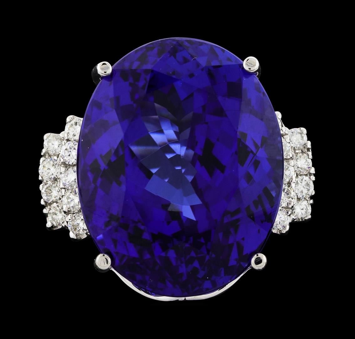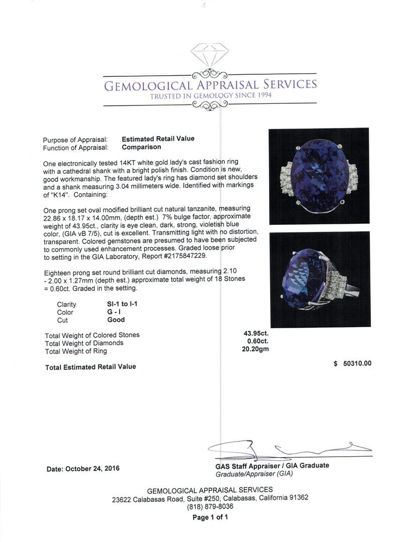 One electronically tested 14KT white gold lady's cast fashion ring with a cathedral shank with a bright polish finish. The featured lady's ring has diamond set shoulders and a shank measuring 3.04 millimeters wide. Identified with markings of 'K14'. Condition is new, good workmanship. Containing: One prong set oval modified brilliant cut natural tanzanite, measuring 22.86 x 18.17 x 14.00mm, (depth est.) 7%. bulge factor, approximate weight of 43.95ct., clarity is eye clean, dark, strong, violetish blue color, (GIA vB 7/5), cut is excellent. Transmitting light with no distortion, transparent. Colored gemstones are presumed to have been subjected to commonly used enhancement processes. Graded loose prior to setting in the GIA Laboratory, Report #2175847229. Eighteen prong set round brilliant cut diamonds, measuring 2.10 - 2.00 x 1.27mm (depth est.) approximate total weight of 18 Stones = 0.60ct. Graded in the setting. Clarity SI-1 to I-1. Color: G - I Cut Good. Total Weight of Colored Stones 43.95ct.. Total Weight of Diamonds 0.60ct.. Total Weight of Ring 20.20gm. GAS Appraised at $50,310.00.