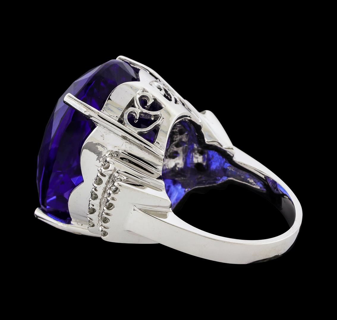 One electronically tested 14KT white gold lady's cast fashion ring with a cathedral shank with a bright polish finish. The featured lady's ring has diamond set shoulders and a shank measuring 3.04 millimeters wide. Identified with markings of 'K14'. Condition is new, good workmanship. Containing: One prong set oval modified brilliant cut natural tanzanite, measuring 22.86 x 18.17 x 14.00mm, (depth est.) 7%. bulge factor, approximate weight of 43.95ct., clarity is eye clean, dark, strong, violetish blue color, (GIA vB 7/5), cut is excellent. Transmitting light with no distortion, transparent. Colored gemstones are presumed to have been subjected to commonly used enhancement processes. Graded loose prior to setting in the GIA Laboratory, Report #2175847229. Eighteen prong set round brilliant cut diamonds, measuring 2.10 - 2.00 x 1.27mm (depth est.) approximate total weight of 18 Stones = 0.60ct. Graded in the setting. Clarity SI-1 to I-1. Color: G - I Cut Good. Total Weight of Colored Stones 43.95ct.. Total Weight of Diamonds 0.60ct.. Total Weight of Ring 20.20gm. GAS Appraised at $50,310.00.