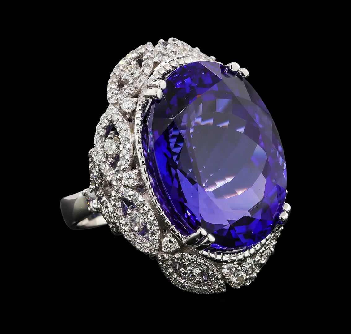 One electronically tested 14KT white gold lady's cast fashion ring with a scalloped basket halo with a bright polish with milgrain detailing finish. The featured lady's ring has a shank measuring 4.22 millimeters wide. Identified with markings of 'K14'. Condition is new, good workmanship. Containing: One prong set oval modified brilliant cut natural tanzanite, measuring 23.20 x 17.72 x 13.58mm, (depth est.) 15%. bulge factor, approximate weight of 45.32ct., clarity is eye clean, dark, strong, violetish blue color, (GIA vB 7/5), cut is very good. Transmitting light with no distortion, transparent. Colored gemstones are presumed to have been subjected to commonly used enhancement processes. Graded loose prior to setting in the GIA Laboratory, Report #2171847377. Two prong set round brilliant cut diamonds, measuring 2.90 - 2.85 x 1.79mm (depth est.) approximate total weight of 2 Stones = 0.18ct. Graded in the setting. Clarity SI-2 to I-1. Color: H - I Cut Good Twenty-Four prong set round brilliant cut diamonds, measuring 2.30 - 2.00 x 1.29mm (depth est.) approximate total weight of 24 Stones = 0.81ct. Graded in the setting. Clarity SI-1 to SI-2. Color: H - I Cut Good One Hundred Sixty-Two prong set round brilliant cut diamonds, measuring 1.30 - 1.20 x 0.75mm (depth est.) approximate total weight of 162 Stones = 1.15ct. Graded in the setting. Clarity SI-1 to I-1. Color: H - I Cut Good. Total Weight of Colored Stones 45.32ct.. Total Weight of Diamonds 2.14ct.. Total Weight of Ring 22.90gm. GAS Appraised at $68,465.00.