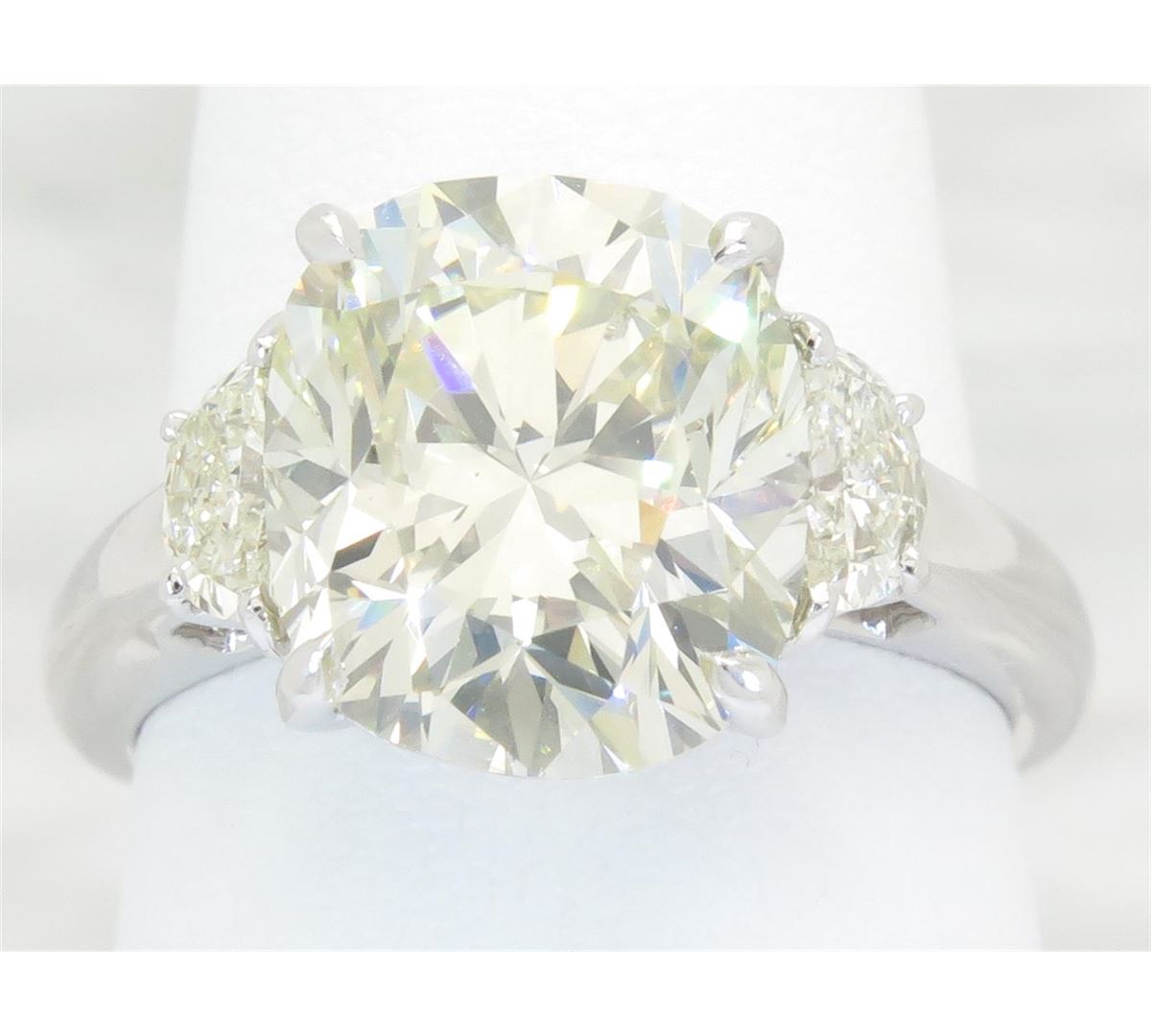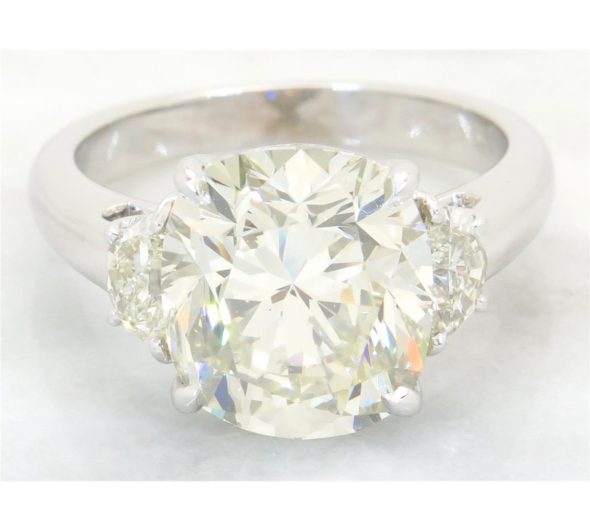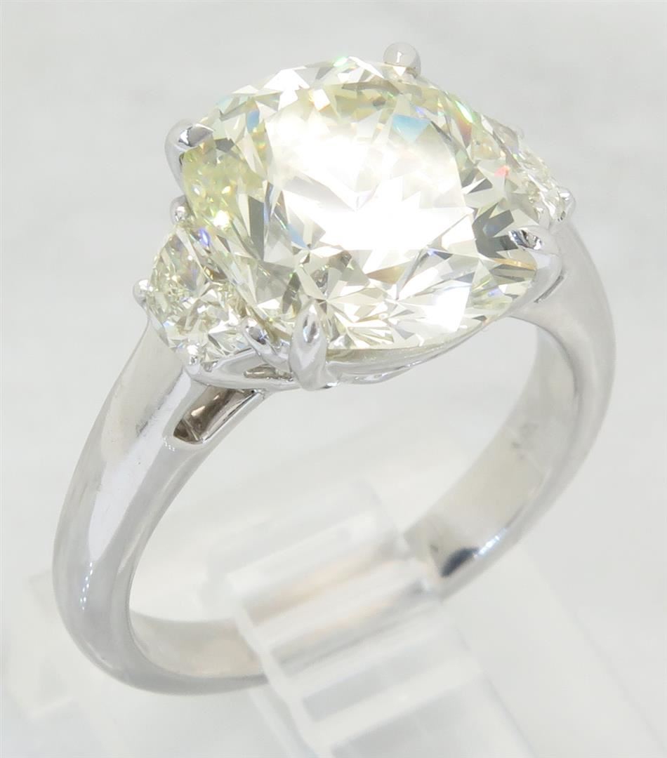 One tested 18K white gold diamond ring. Containing: One GIA Certified Cushion Cut Diamond. Size: 4.74CT, Clarity: VS2, Color: M. Two Half Moon Cut Diamonds. Approximate total diamond weight: 5.14CTW. All diamonds are graded in the mounting unless otherwise stated. Weight of ring: 6.0 grams, Size: 5.5.