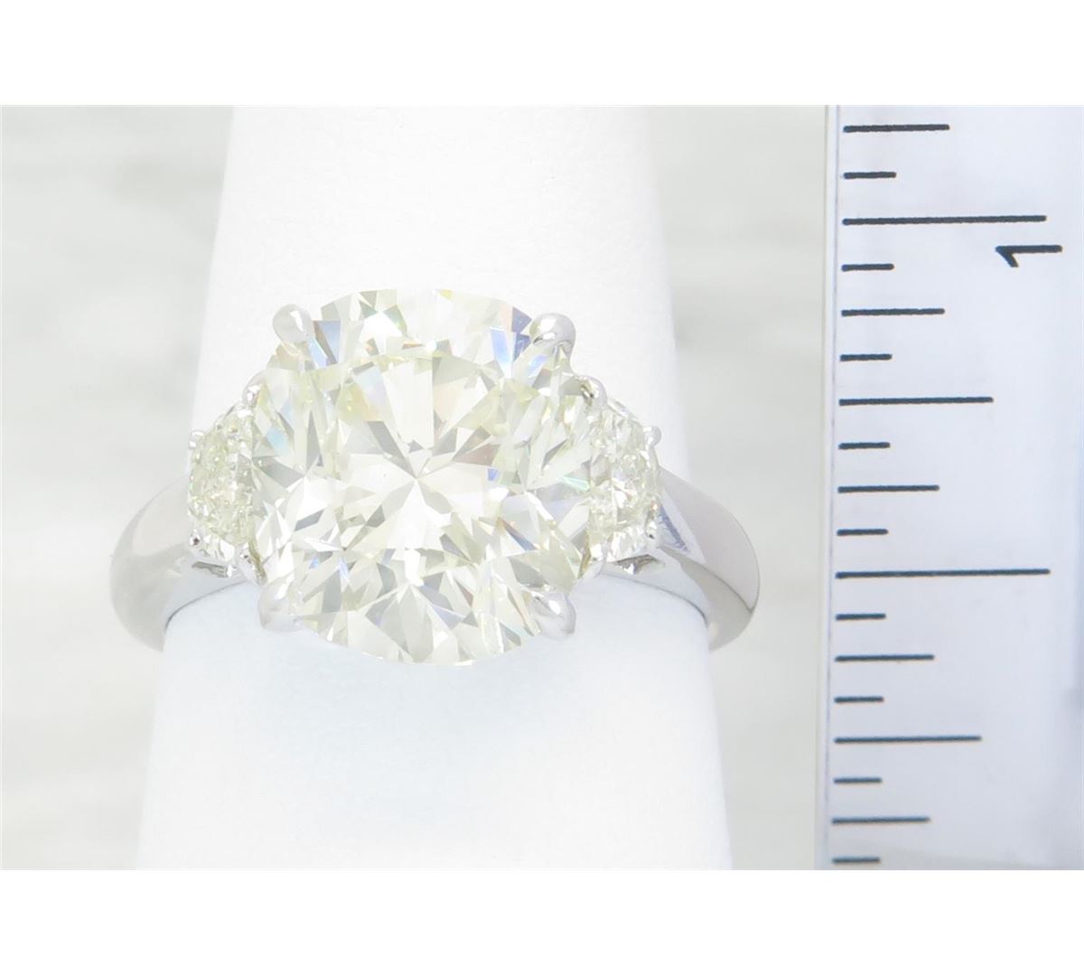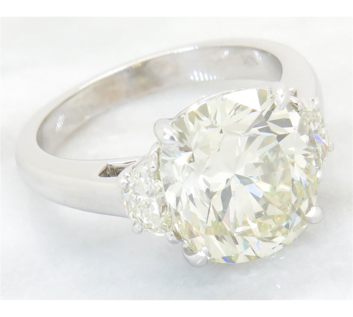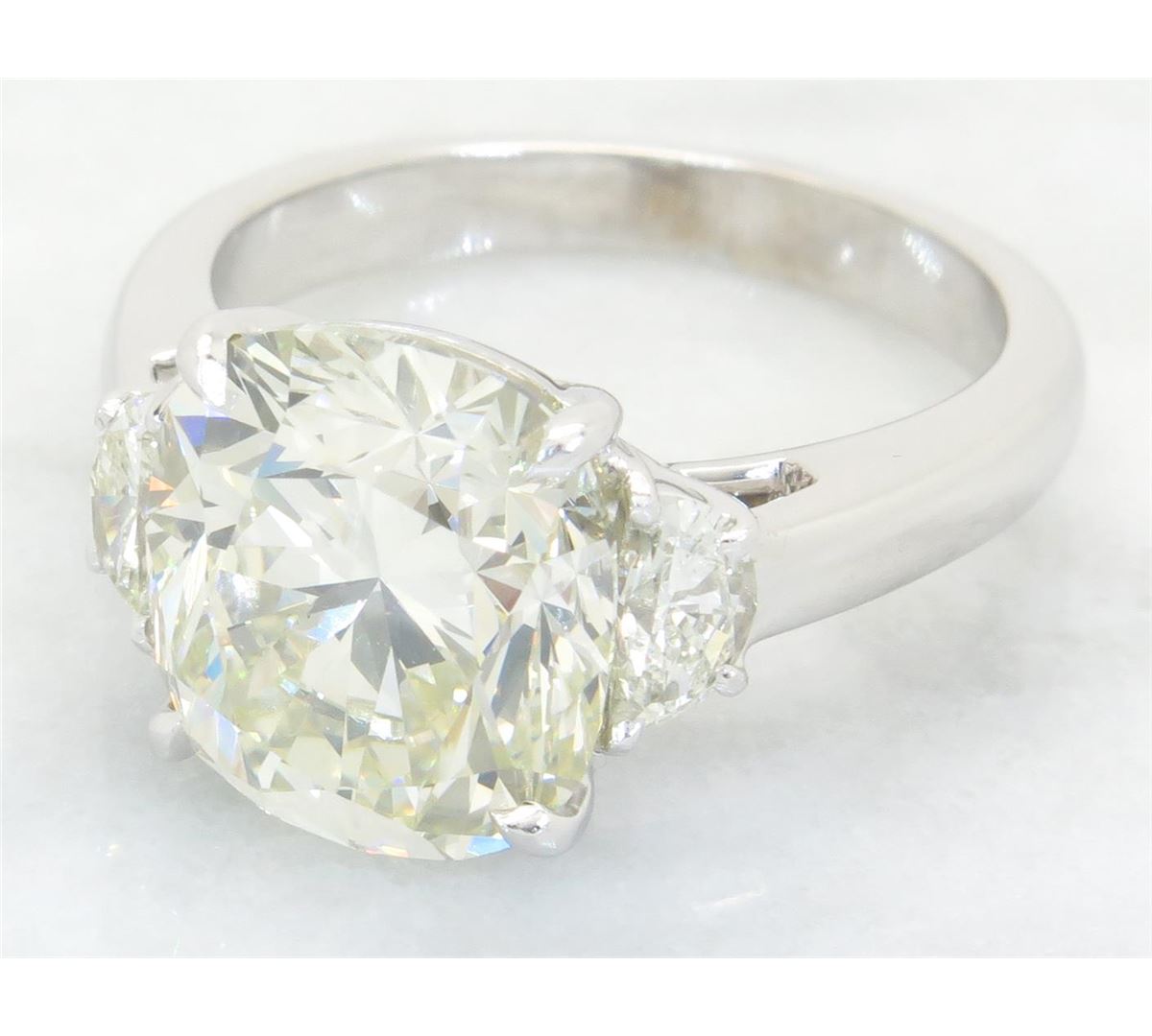 One tested 18K white gold diamond ring. Containing: One GIA Certified Cushion Cut Diamond. Size: 4.74CT, Clarity: VS2, Color: M. Two Half Moon Cut Diamonds. Approximate total diamond weight: 5.14CTW. All diamonds are graded in the mounting unless otherwise stated. Weight of ring: 6.0 grams, Size: 5.5.