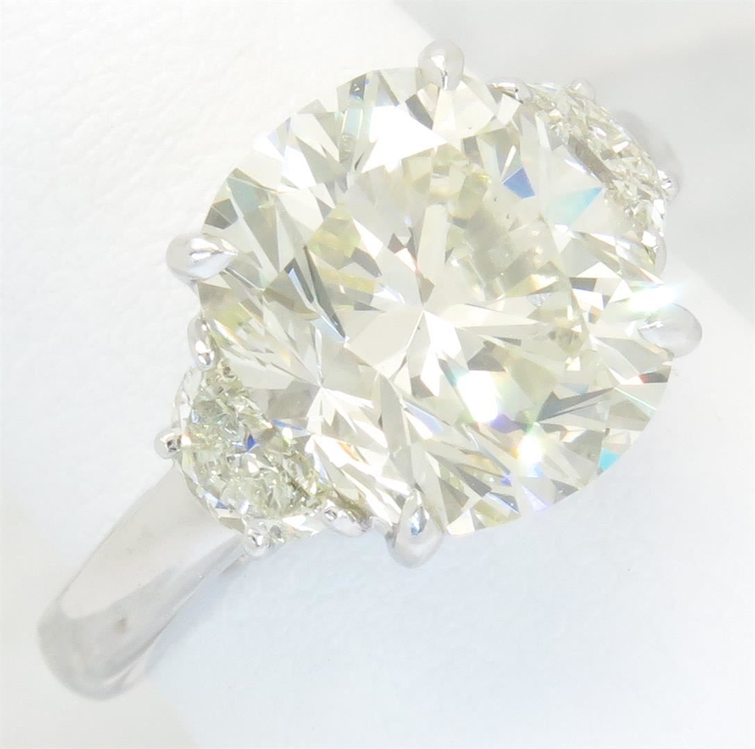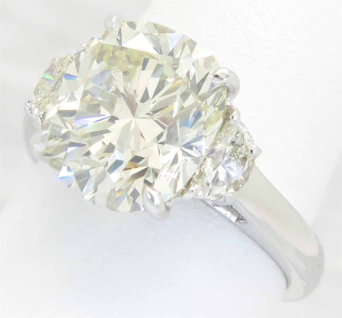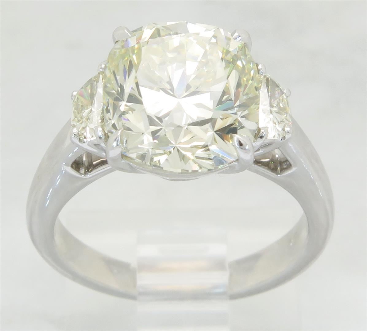 One tested 18K white gold diamond ring. Containing: One GIA Certified Cushion Cut Diamond. Size: 4.74CT, Clarity: VS2, Color: M. Two Half Moon Cut Diamonds. Approximate total diamond weight: 5.14CTW. All diamonds are graded in the mounting unless otherwise stated. Weight of ring: 6.0 grams, Size: 5.5.