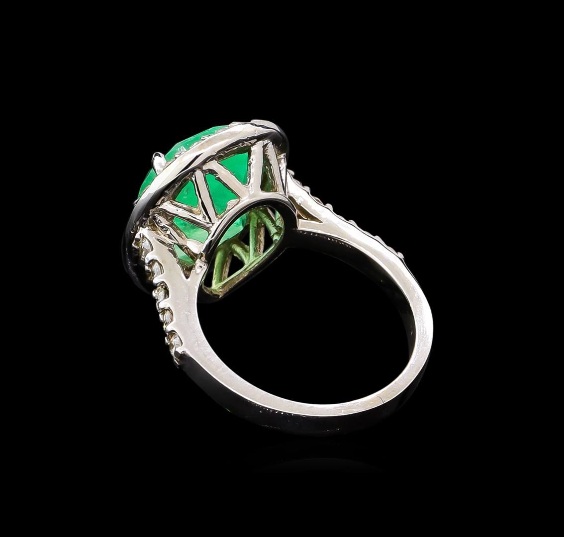 One electronically tested 14KT white gold lady's cast fashion ring with a basket halo with a bright polish finish. The featured lady's ring has a shank measuring 2.55 millimeters wide. Identified with markings of "14K". Condition is new, good workmanship. Containing: One prong set pear modified brilliant cut natural emerald, measuring 15.11 x 9.96 x 7.21mm, exact weight 5.49ct., clarity is moderately included, type III, medium, very slightly grayish, green color, (GIA G 5/3), cut is good. Transmitting light somewhat diffusely, transparent to translucent. Naturally occurring internal & external characteristics are present. Clarity enhanced. Graded loose prior to setting in the GIA Laboratory, Report #2175501837.Thirty prong set round brilliant cut diamonds, measuring 1.90 - 1.80 x 1.13mm (depth est.) approximate total weight of 30 Stones = 0.70ct. Graded in the setting. Clarity: SI-1 to I-1. Color: G - I. Cut Good. Total Weight of Colored Stones 5.49ct. Total Weight of Diamonds 0.70ct. Total Weight of Ring 6.70gm. GAS Appraised at $10,805.00.