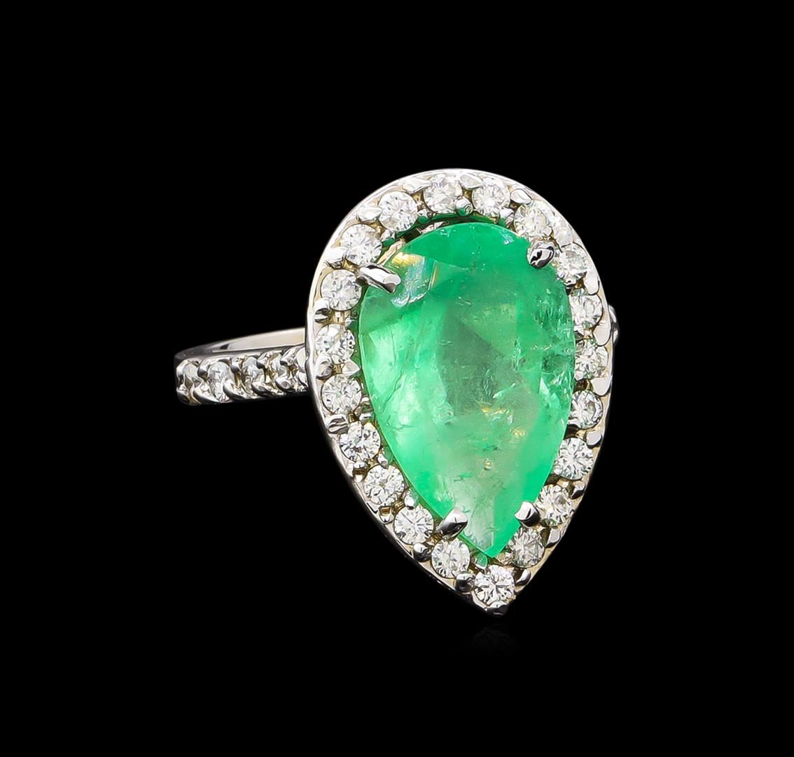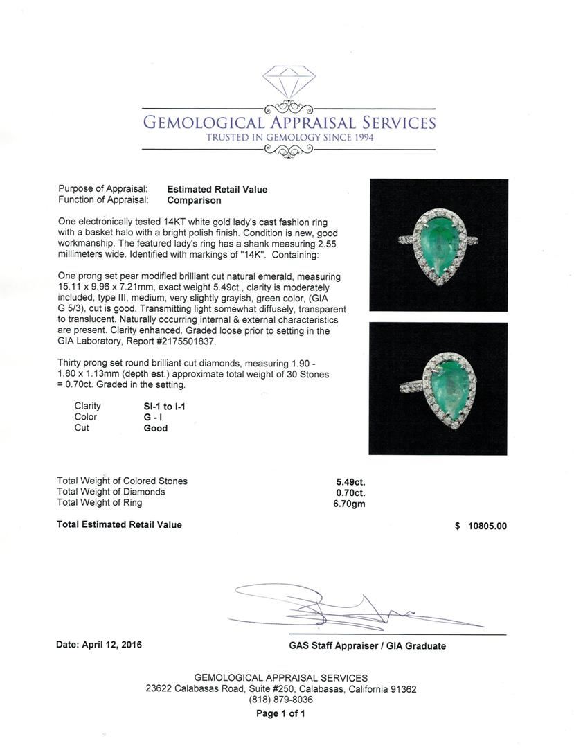 One electronically tested 14KT white gold lady's cast fashion ring with a basket halo with a bright polish finish. The featured lady's ring has a shank measuring 2.55 millimeters wide. Identified with markings of "14K". Condition is new, good workmanship. Containing: One prong set pear modified brilliant cut natural emerald, measuring 15.11 x 9.96 x 7.21mm, exact weight 5.49ct., clarity is moderately included, type III, medium, very slightly grayish, green color, (GIA G 5/3), cut is good. Transmitting light somewhat diffusely, transparent to translucent. Naturally occurring internal & external characteristics are present. Clarity enhanced. Graded loose prior to setting in the GIA Laboratory, Report #2175501837.Thirty prong set round brilliant cut diamonds, measuring 1.90 - 1.80 x 1.13mm (depth est.) approximate total weight of 30 Stones = 0.70ct. Graded in the setting. Clarity: SI-1 to I-1. Color: G - I. Cut Good. Total Weight of Colored Stones 5.49ct. Total Weight of Diamonds 0.70ct. Total Weight of Ring 6.70gm. GAS Appraised at $10,805.00.