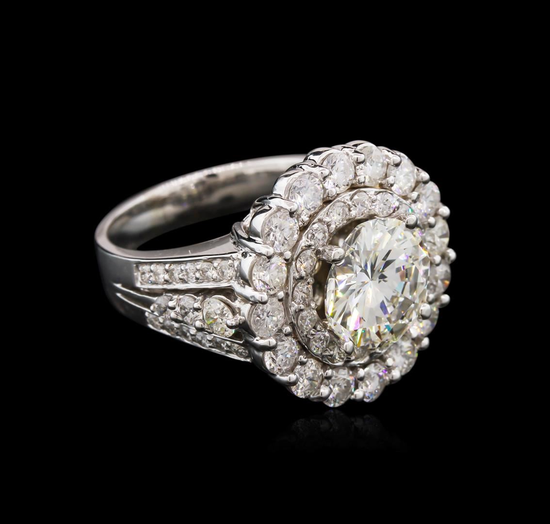 One electronically tested 14KT white gold lady's cast wedding ring with a basket halo with a bright polish finish. The featured lady's ring has a shank measuring 4.01 millimeters wide. Identified with markings of "K14". Condition is new, good workmanship. Containing: One prong set round brilliant cut diamond, measuring 9.67 - 9.45 x 5.59mm (depth est.) approximate weight of 3.03ct. Graded loose prior to setting in the GIA Laboratory. Clarity: VVS-1. Color: I. Cut Fair Eighteen prong set round brilliant cut diamonds, measuring 3.00 - 2.90 x 1.77mm (depth est.) approximate total weight of 18 Stones = 1.68ct. Graded in the setting. Clarity: SI-2 to I-1. Color: H - I. Cut Good Four prong set round brilliant cut diamonds, measuring 2.40 - 2.10 x 1.35mm (depth est.) approximate total weight of 4 Stones = 0.17ct. Graded in the setting. Clarity: SI-2 to I-1. Color: H - I. Cut Good Sixteen prong set round brilliant cut diamonds, measuring 1.90 - 1.80 x 1.18mm (depth est.) approximate total weight of 16 Stones = 0.40ct. Graded in the setting. Clarity: SI-1 to I-1. Color: H - I. Cut Good Twenty-Four bead set round brilliant cut diamonds, measuring 1.40 - 1.30 x 0.82mm (depth est.) approximate total weight of 24 Stones = 0.22ct. Graded in the setting. Clarity: SI-1 to I-1. Color: H - I. Cut Good. Total Weight of Diamonds 5.50ct. Total Weight of Ring 12.00 grams. GAS Appraised at $129,355.00.