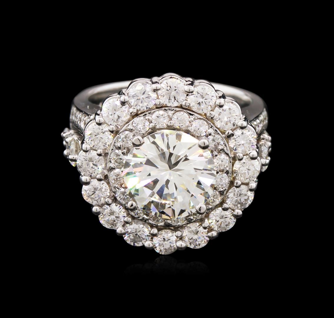 One electronically tested 14KT white gold lady's cast wedding ring with a basket halo with a bright polish finish. The featured lady's ring has a shank measuring 4.01 millimeters wide. Identified with markings of "K14". Condition is new, good workmanship. Containing: One prong set round brilliant cut diamond, measuring 9.67 - 9.45 x 5.59mm (depth est.) approximate weight of 3.03ct. Graded loose prior to setting in the GIA Laboratory. Clarity: VVS-1. Color: I. Cut Fair Eighteen prong set round brilliant cut diamonds, measuring 3.00 - 2.90 x 1.77mm (depth est.) approximate total weight of 18 Stones = 1.68ct. Graded in the setting. Clarity: SI-2 to I-1. Color: H - I. Cut Good Four prong set round brilliant cut diamonds, measuring 2.40 - 2.10 x 1.35mm (depth est.) approximate total weight of 4 Stones = 0.17ct. Graded in the setting. Clarity: SI-2 to I-1. Color: H - I. Cut Good Sixteen prong set round brilliant cut diamonds, measuring 1.90 - 1.80 x 1.18mm (depth est.) approximate total weight of 16 Stones = 0.40ct. Graded in the setting. Clarity: SI-1 to I-1. Color: H - I. Cut Good Twenty-Four bead set round brilliant cut diamonds, measuring 1.40 - 1.30 x 0.82mm (depth est.) approximate total weight of 24 Stones = 0.22ct. Graded in the setting. Clarity: SI-1 to I-1. Color: H - I. Cut Good. Total Weight of Diamonds 5.50ct. Total Weight of Ring 12.00 grams. GAS Appraised at $129,355.00.
