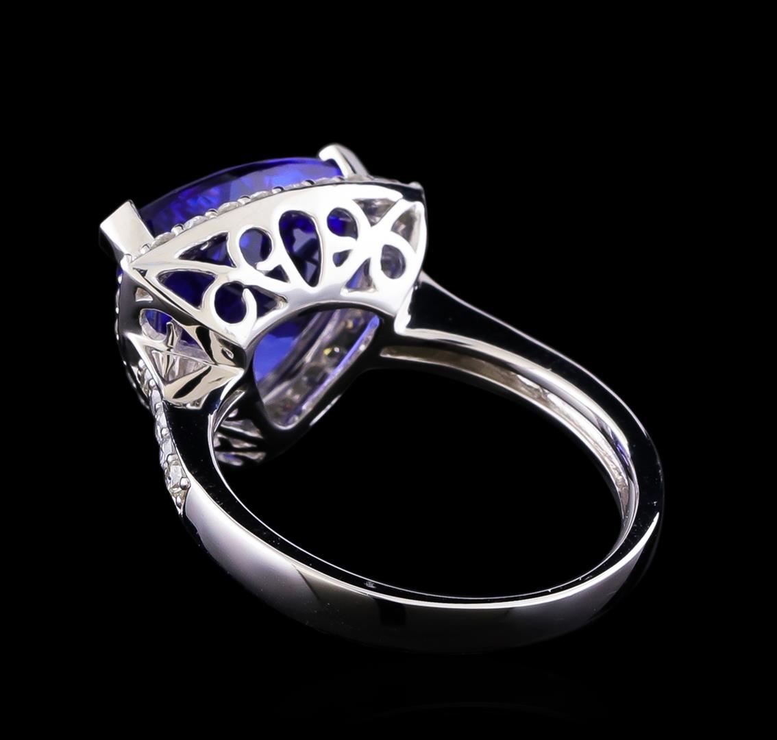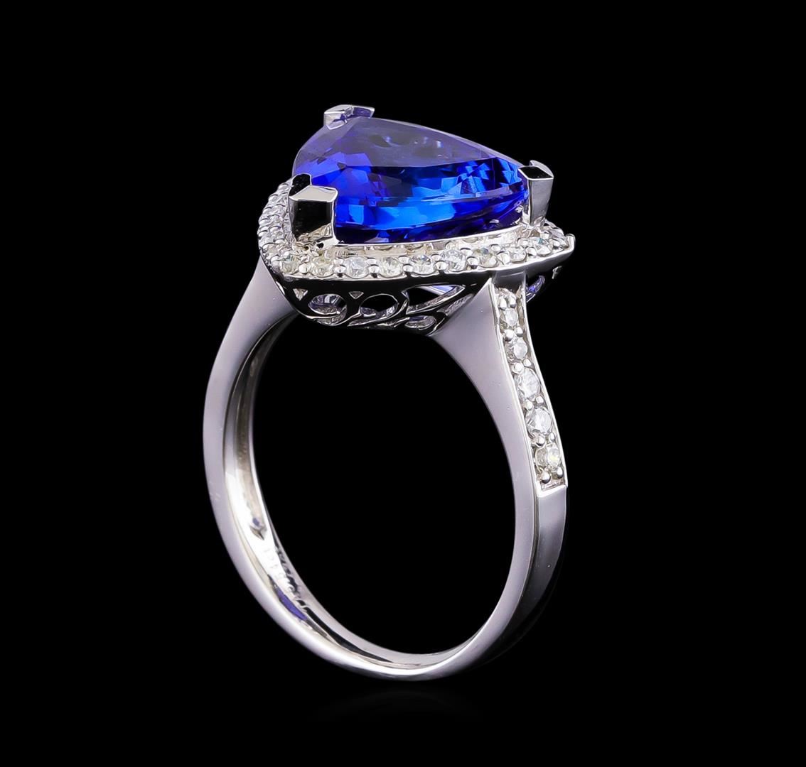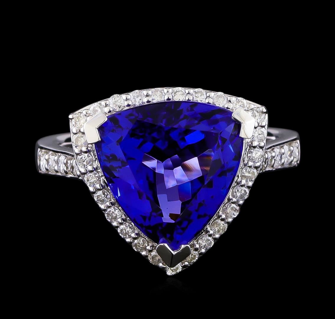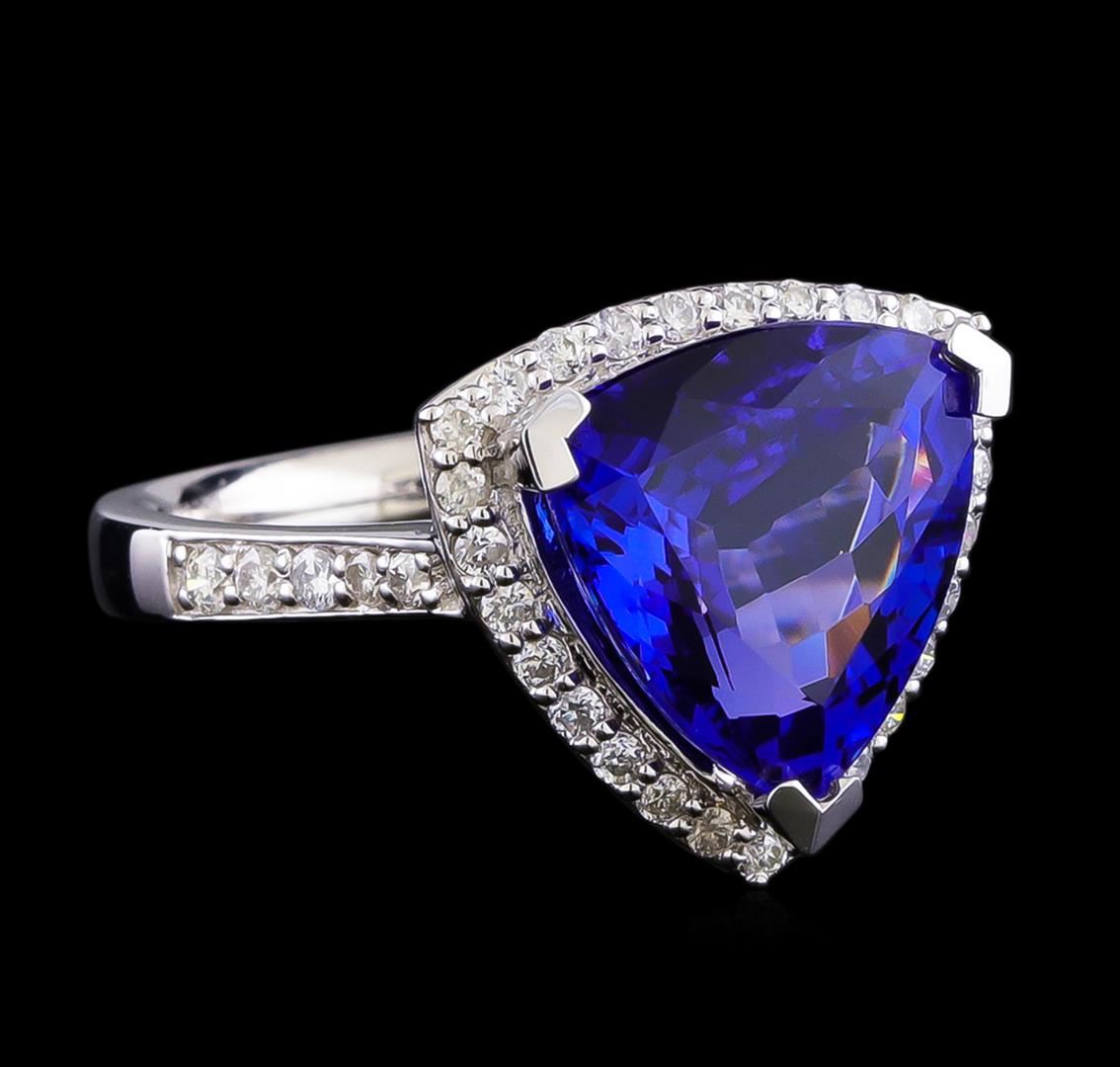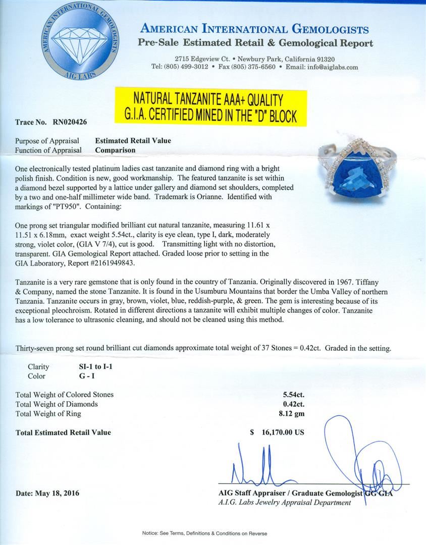 One electronically tested platinum ladies cast tanzanite and diamond ring with a bright polish finish. The featured tanzanite is set within a diamond bezel supported by a lattice under gallery and diamond set shoulders, completed by a two and one-half millimeter wide band. Trademark is Orianne. Identified with markings of "PT950". Condition is new, good workmanship. Containing: One prong set triangular modified brilliant cut natural tanzanite, measuring 11.61 x 11.51 x 6.18mm, exact weight 5.54ct., clarity is eye clean, type I, dark, moderately strong, violet color, (GIA V 7/4), cut is good. Transmitting light with no distortion, transparent. GIA Gemological Report attached. Graded loose prior to setting in the GIA Laboratory, Report #2161949843.Tanzanite is a very rare gemstone that is only found in the country of Tanzania. Originally discovered in 1967. Tiffany & Company, named the stone Tanzanite. It is found in the Usumburu Mountains that border the Umba Valley of northern Tanzania. Tanzanite occurs in gray, brown, violet, blue, reddish-purple, & green. The gem is interesting because of its exceptional pleochroism. Rotated in different directions a tanzanite will exhibit multiple changes of color. Tanzanite has a low tolerance to ultrasonic cleaning, and should not be cleaned using this method. Thirty-Seven prong set round brilliant cut diamonds approximate total weight of 37 Stones = 0.42ct. Graded in the setting. Clarity: SI-1 to I-1. Color: G - I. Total Weight of Colored Stones 5.54ct. Total Weight of Diamonds 0.42ct. Total Weight of Ring 8.12gm. AIG Appraised at $16,170.00.
