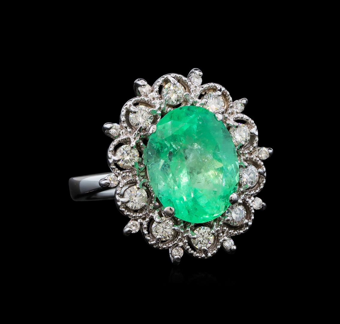One electronically tested 14KT white gold lady's cast fashion ring with a scalloped basket halo with a bright polish with milgrain detailing finish. The featured lady's ring has a shank measuring 2.90 millimeters wide. Identified with markings of 'K14'. Condition is new, good workmanship. Containing: One prong set oval modified brilliant cut natural emerald, measuring 13.04 x 10.43 x 7.92mm, (depth est.) approximate weight of 5.88ct., clarity is heavily included, medium, moderately strong, green color, (GIA G 5/4), cut is very good. Transmitting light somewhat diffusely, transparent to translucent. Naturally occurring internal & external characteristics are present. Indications of oil residue. Colored gemstones are presumed to have been subjected to commonly used enhancement processes. Graded loose prior to setting in the GIA Laboratory, Report #2171665084. Ten prong set round brilliant cut diamonds, measuring 2.60 - 2.50 x 1.58mm (depth est.) approximate total weight of 10 Stones = 0.65ct. Graded in the setting. Clarity SI-1 to I-1. Color: H - I Cut Good Ten prong set round brilliant cut diamonds, measuring 1.30 - 1.25 x 0.79mm (depth est.) approximate total weight of 10 Stones = 0.08ct. Graded in the setting. Clarity SI-1 to SI-2. Color: H - I Cut Good. Total Weight of Colored Stones 5.88ct.. Total Weight of Diamonds 0.73ct.. Total Weight of Ring 7.90gm. GAS Appraised at $11,275.00.