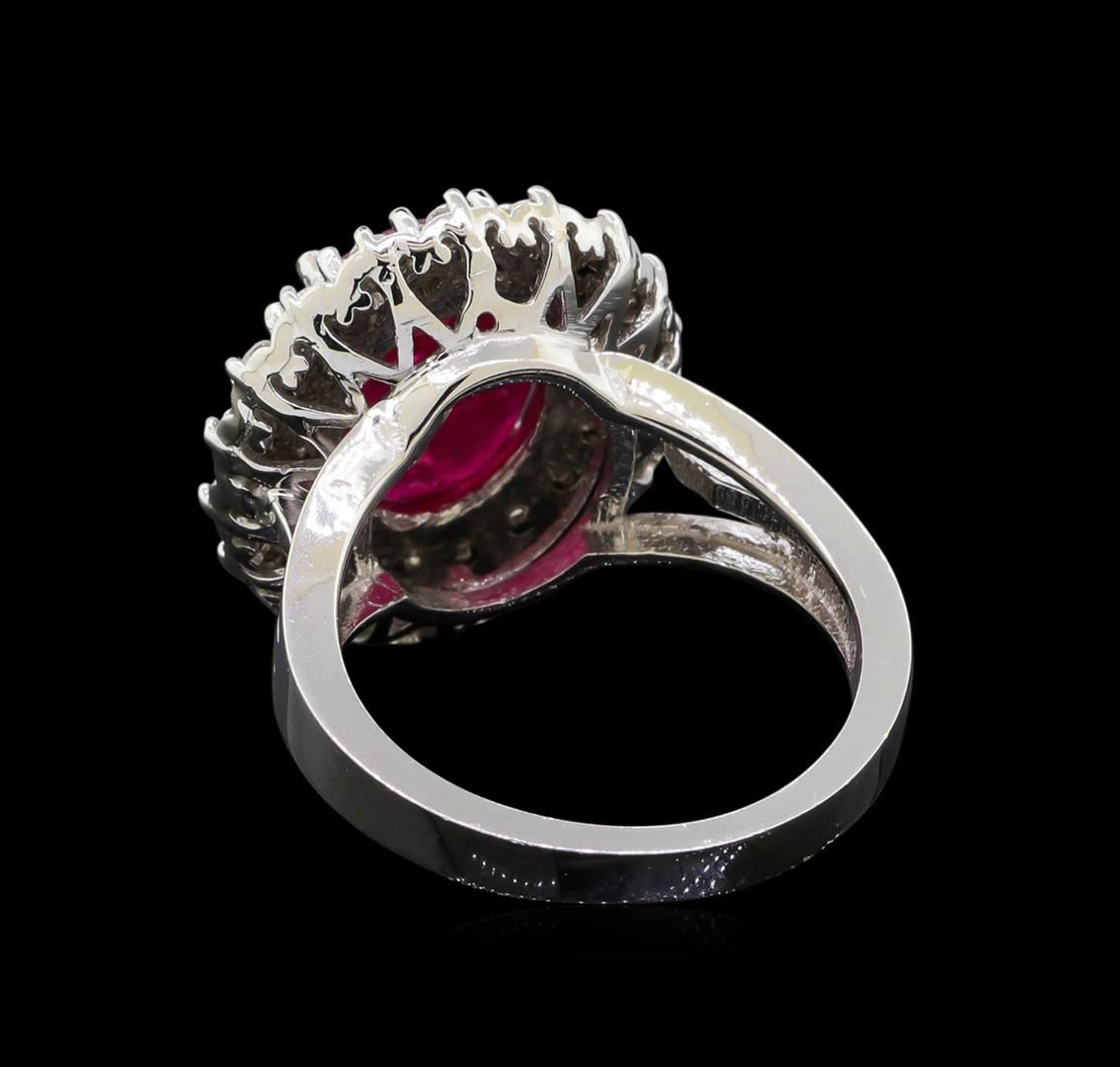 One electronically tested 14KT white gold lady's cast fashion ring with a double basket halo with a bright polish finish. The featured lady's ring has a shank measuring 2.79 millimeters wide. Identified with markings of '14K'. Condition is new, good workmanship. Containing: One prong set oval modified mixed cut natural ruby, measuring 12.49 x 10.04 x 4.94mm, (depth est.) 14%. bulge factor, approximate weight of 5.91ct., clarity is severely included, medium dark, very slightly brownish, red color, (GIA R 6/3), cut is very good. Transmitting light somewhat diffusely, semi-transparent to translucent. Naturally occurring internal & external characteristics are present. Colored gemstones are presumed to have been subjected to commonly used enhancement processes. Graded loose prior to setting in the GIA Laboratory, Report #1172603098. Eighteen prong set round brilliant cut diamonds, measuring 2.10 - 2.00 x 1.27mm (depth est.) approximate total weight of 18 Stones = 0.60ct. Graded in the setting. Clarity SI-1 to SI-2. Color: H - I Cut Good Eighteen prong set round brilliant cut diamonds, measuring 1.75 - 1.65 x 1.04mm (depth est.) approximate total weight of 18 Stones = 0.33ct. Graded in the setting. Clarity SI-1 to SI-2. Color: H - I Cut Good. Total Weight of Colored Stones 5.91ct.. Total Weight of Diamonds 0.93ct.. Total Weight of Ring 10.40gm. GAS Appraised at $13,855.00.