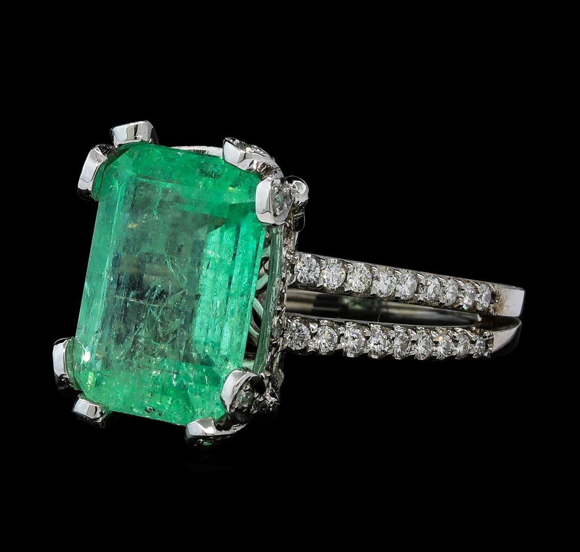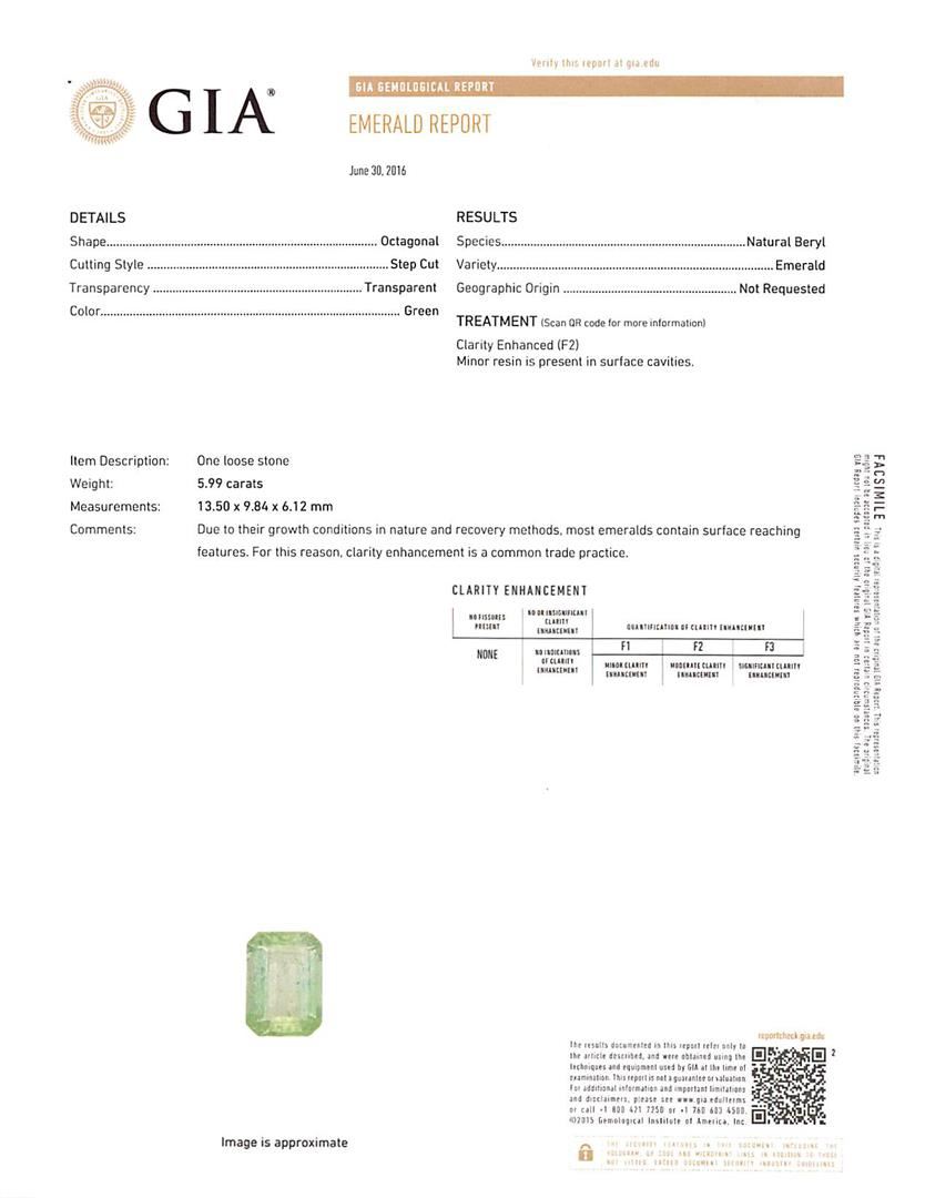 One electronically tested 14KT white gold ladies cast emerald and diamond ring with a bright polish finish. The featured emerald is set within a diamond accented basket supported by diamond set split shoulders, completed by a two and one-half millimeter wide band. Identified with markings of '14K'. Condition is new, good workmanship. Containing: One prong set octagonal step cut natural emerald, measuring 13.50 x 9.84 x 6.12mm, exact weight 5.99ct., clarity is moderately included, type III, medium light, very slightly grayish, green color, (GIA G 4/3), cut is good. Transmitting light with a minimum of distortion, transparent. Naturally occurring internal & external characteristics are present. Minor resin is present in surface cavities. GIA Gemological Report attached. Graded loose prior to setting in the GIA Laboratory, Report #2175665550. Thirty-Six prong set round brilliant cut diamonds, measuring 1.40 - 1.30 x 0.81mm (depth est.) approximate total weight of 36 Stones = 0.36ct. Graded in the setting. Clarity I-1 to I-2. Color: F - H Fifty-Two bead set round brilliant cut diamonds, measuring 1.10 - 1.00 x 0.63mm (depth est.) approximate total weight of 52 Stones = 0.24ct. Graded in the setting. Clarity I-1 to I-2. Color: F - H. Total Weight of Colored Stones 5.99ct.. Total Weight of Diamonds 0.60ct.. Total Weight of Ring 6.62gm. AIG Appraised at $8,420.00.