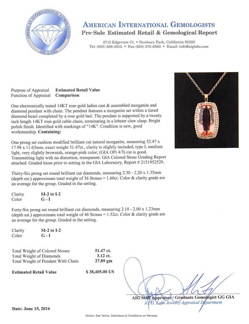One prong set cushion modified brilliant cut natural morganite, measuring 32.47 x 17.98 x 11.63mm, exact weight 51.47ct., clarity is slightly included, type I, cut is good. Transmitting light with no distortion, transparent. GIA Colored Stone Grading Report attached. Graded loose prior to setting in the GIA Laboratory, Report # 2151952529.Thirty-Six prong set round brilliant cut diamonds, measuring 2.30 - 2.20 x 1.35mm (depth est.) approximate total weight of 36 Stones = 1.60ct. Color & clarity grade are an average for the group. Graded in the setting. Clarity: SI-2 to I-2. Color: G - I Forty-Six prong set round brilliant cut diamonds, measuring 2.10 - 2.00 x 1.23mm (depth est.) approximate total weight of 46 Stones = 1.52ct. Color & clarity grade are an average for the group. Graded in the setting. Clarity: SI-2 to I-2. Color: G - I. Total Weight of Colored Stones 51.47ct. Total Weight of Diamonds 3.12ct. Total Weight of Pendant With Chain 27.89gm. AIG Appraised at $38,405.00.
