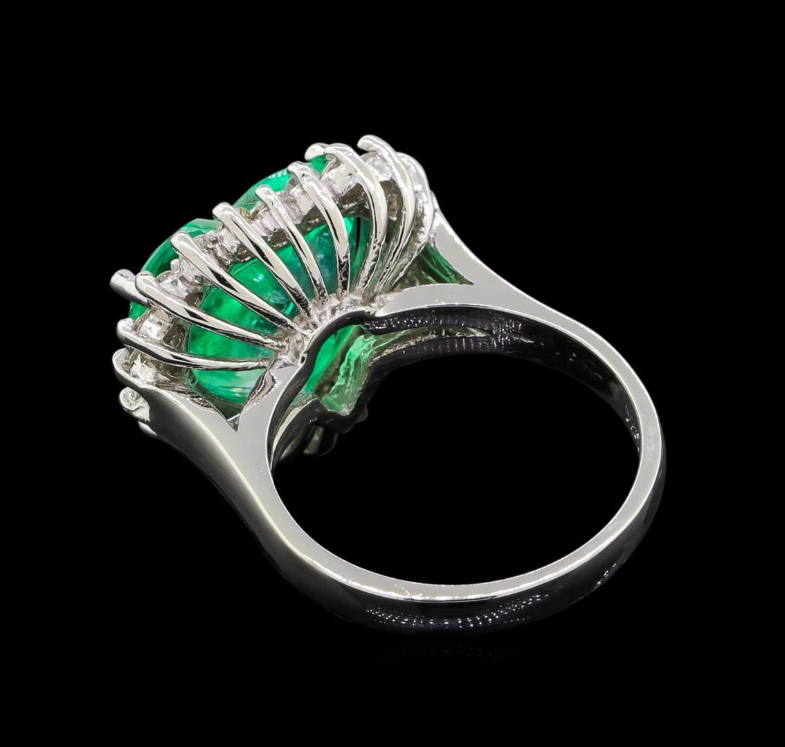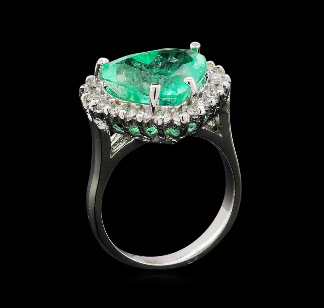 One electronically tested 14KT white gold lady's cast heart shape ring with a basket halo with a bright polish finish. The featured lady's ring has a shank measuring 2.57 millimeters wide. Identified with markings of '14K'. Condition is new, good workmanship. Containing: One prong set heart modified brilliant cut natural emerald, measuring 12.20 x 12.82 x 8.10mm, (depth est.) approximate weight of 6.11ct., clarity is moderately included, medium, strong, green color, (GIA G 5/5), cut is very good. Transmitting light with a minimum of distortion, transparent. Naturally occurring internal & external characteristics are present. Indications of oil residue. Colored gemstones are presumed to have been subjected to commonly used enhancement processes. Graded loose prior to setting in the GIA Laboratory, Report #5172612122. Twenty-Two prong set round brilliant cut diamonds, measuring 2.10 - 2.00 x 1.27mm (depth est.) approximate total weight of 22 Stones = 0.73ct. Graded in the setting. Clarity SI-1 to SI-2. Color: H - I Cut Good. Total Weight of Colored Stones 6.11ct.. Total Weight of Diamonds 0.73ct.. Total Weight of Ring 7.30gm. GAS Appraised at $29,490.00.