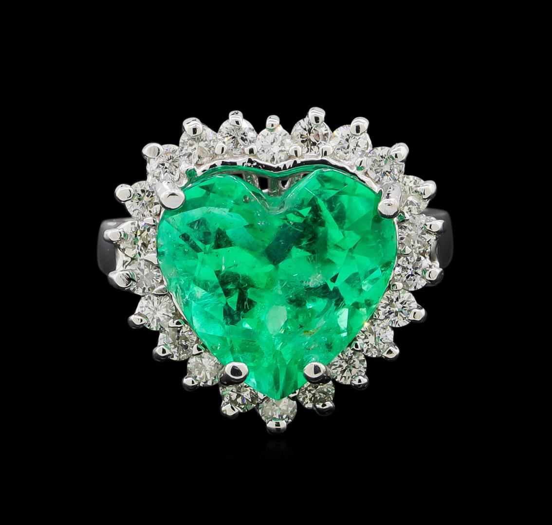 One electronically tested 14KT white gold lady's cast heart shape ring with a basket halo with a bright polish finish. The featured lady's ring has a shank measuring 2.57 millimeters wide. Identified with markings of '14K'. Condition is new, good workmanship. Containing: One prong set heart modified brilliant cut natural emerald, measuring 12.20 x 12.82 x 8.10mm, (depth est.) approximate weight of 6.11ct., clarity is moderately included, medium, strong, green color, (GIA G 5/5), cut is very good. Transmitting light with a minimum of distortion, transparent. Naturally occurring internal & external characteristics are present. Indications of oil residue. Colored gemstones are presumed to have been subjected to commonly used enhancement processes. Graded loose prior to setting in the GIA Laboratory, Report #5172612122. Twenty-Two prong set round brilliant cut diamonds, measuring 2.10 - 2.00 x 1.27mm (depth est.) approximate total weight of 22 Stones = 0.73ct. Graded in the setting. Clarity SI-1 to SI-2. Color: H - I Cut Good. Total Weight of Colored Stones 6.11ct.. Total Weight of Diamonds 0.73ct.. Total Weight of Ring 7.30gm. GAS Appraised at $29,490.00.