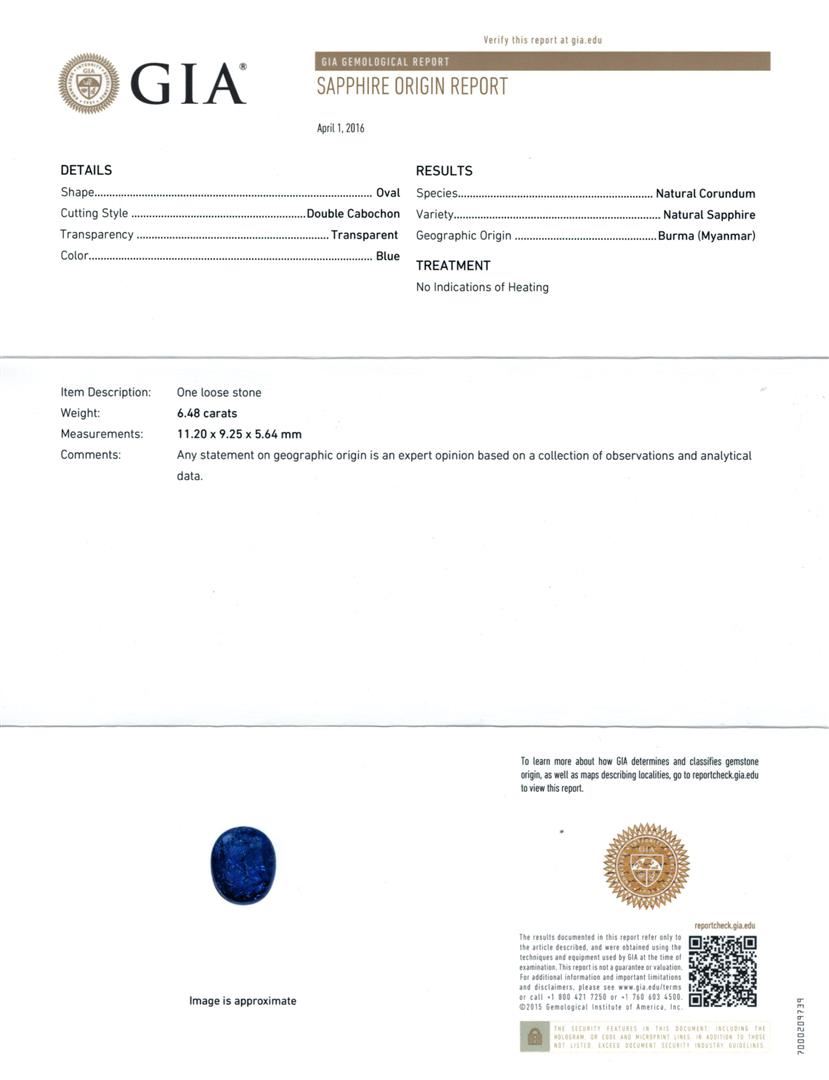 One electronically tested 14KT white gold lady's cast fashion vintage ring with a cathedral basket halo with a bright polish with milgrain detailing finish. The featured lady's ring has a shank measuring 4.28 millimeters in width. Identified with markings of "14K". Condition is new, good workmanship. Containing: One prong set oval cabochon cut natural blue sapphire, measuring 11.20 x 9.25 x 5.64mm, (depth est.) 5%. bulge factor, approximate weight of 6.48ct., clarity is eye clean, medium dark, strong, blue color, (GIA B 6/5), cut is very good. Graded loose prior to setting in the GIA Laboratory, Report #7221210490. No indication of heat. Geographic origin Burma. Transmitting light somewhat diffusely, transparent to translucent. Eighteen prong set round brilliant cut diamonds, measuring 2.35 - 2.30 x 1.44mm (depth est.) approximate total weight of 18 Stones = 0.85ct. Graded in the setting. Clarity: VS-2 to SI-1. Color: H - I. Cut Very Good Twenty prong set round brilliant cut diamonds, measuring 1.70 - 1.65 x 1.04mm (depth est.) approximate total weight of 20 Stones = 0.36ct. Graded in the setting. Clarity: VS-1 to SI-1. Color: G - Good Forty-Two prong set round brilliant cut diamonds, measuring 1.30 - 1.20 x 0.78mm (depth est.) approximate total weight of 42 Stones = 0.31ct. Graded in the setting. Clarity: VS-2 to SI-1. Color: G - Good. Total Weight of Colored Stones 6.48ct. Total Weight of Diamonds 1.52ct. Total Weight of Ring 9.10gm. GAS Appraised at $43,985.00.