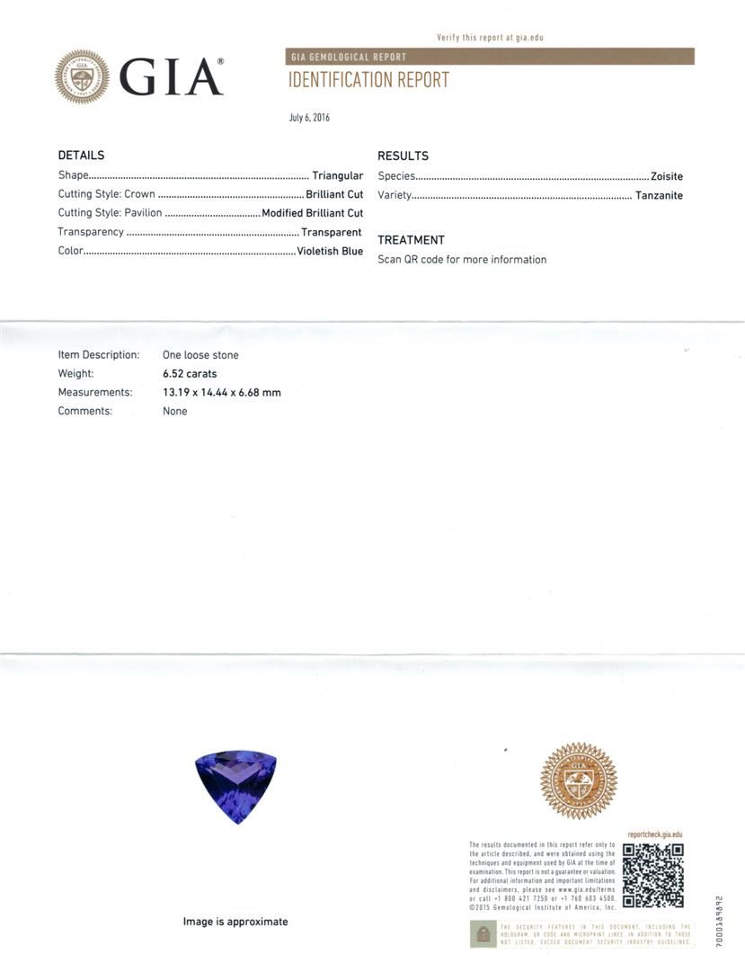 One electronically tested 14KT white gold lady's cast fashion ring with a halo with a bright polish finish. The featured lady's ring has a shank measuring 3.15 millimeters wide. Identified with markings of '14K'. Condition is new, good workmanship. Containing: One prong set triangle modified brilliant cut natural tanzanite, measuring 13.19 x 14.44 x 6.68mm, (depth est.) approximate weight of 6.52ct., clarity is eye clean, medium dark, strong, violetish blue color, (GIA vB 6/5), cut is very good. Transmitting light with no distortion, transparent. Colored gemstones are presumed to have been subjected to commonly used enhancement processes. Graded loose prior to setting in the GIA Laboratory, Report #1172665821. Fifteen prong set round brilliant cut diamonds, measuring 1.80 - 1.70 x 1.09mm (depth est.) approximate total weight of 15 Stones = 0.31ct. Graded in the setting. Clarity SI-1 to I-1. Color: H - I Cut Good. Total Weight of Colored Stones 6.52ct.. Total Weight of Diamonds 0.31ct.. Total Weight of Ring 9.50gm. GAS Appraised at $13,395.00.