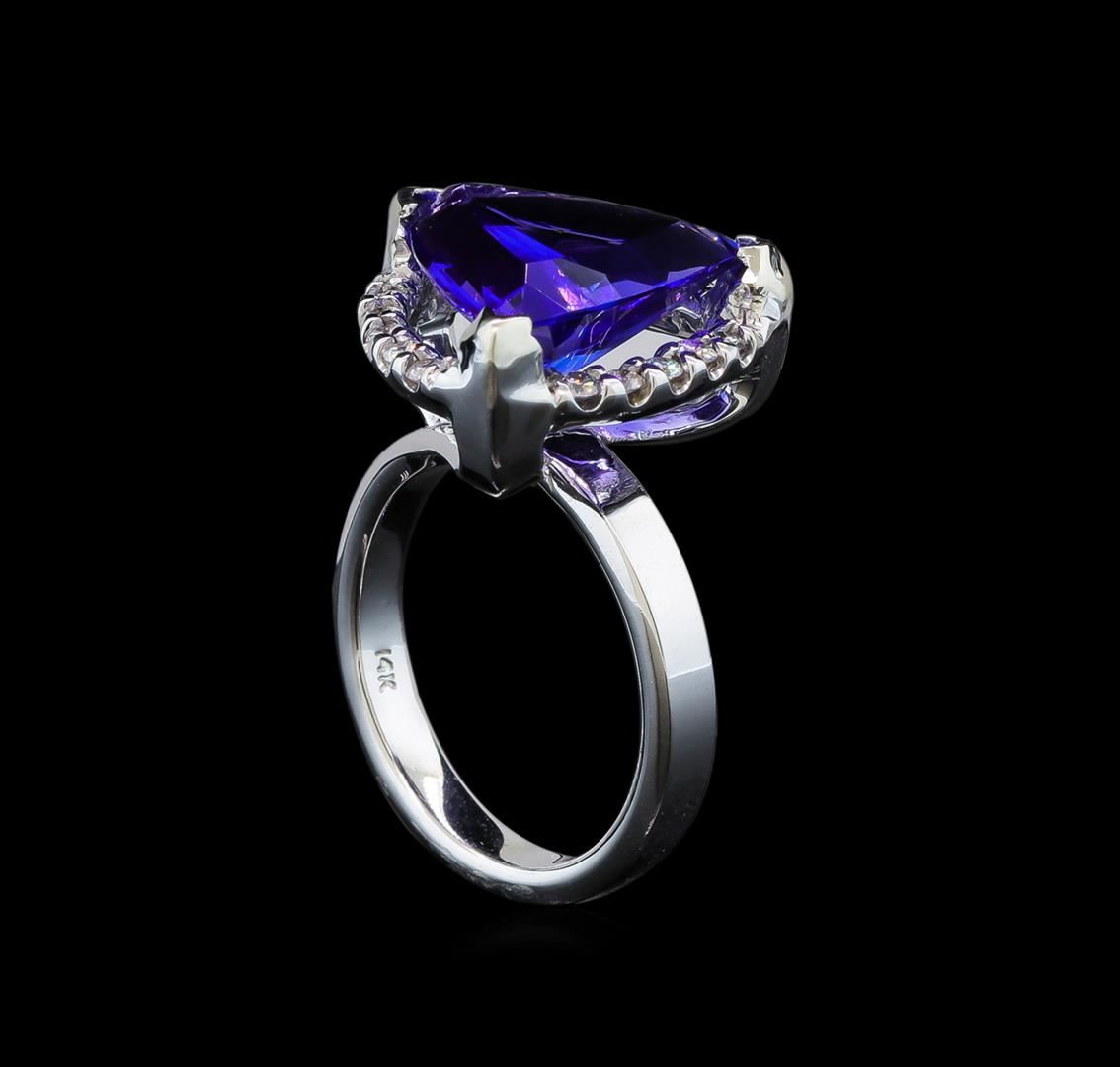 One electronically tested 14KT white gold lady's cast fashion ring with a halo with a bright polish finish. The featured lady's ring has a shank measuring 3.15 millimeters wide. Identified with markings of '14K'. Condition is new, good workmanship. Containing: One prong set triangle modified brilliant cut natural tanzanite, measuring 13.19 x 14.44 x 6.68mm, (depth est.) approximate weight of 6.52ct., clarity is eye clean, medium dark, strong, violetish blue color, (GIA vB 6/5), cut is very good. Transmitting light with no distortion, transparent. Colored gemstones are presumed to have been subjected to commonly used enhancement processes. Graded loose prior to setting in the GIA Laboratory, Report #1172665821. Fifteen prong set round brilliant cut diamonds, measuring 1.80 - 1.70 x 1.09mm (depth est.) approximate total weight of 15 Stones = 0.31ct. Graded in the setting. Clarity SI-1 to I-1. Color: H - I Cut Good. Total Weight of Colored Stones 6.52ct.. Total Weight of Diamonds 0.31ct.. Total Weight of Ring 9.50gm.