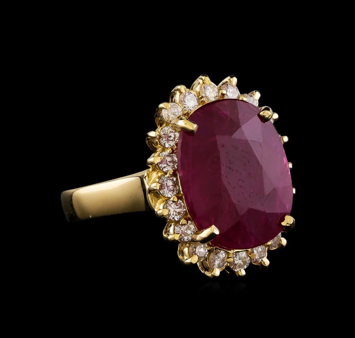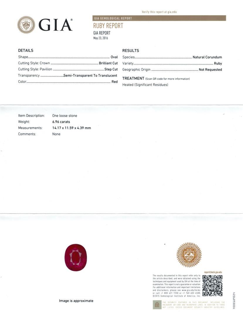 One electronically tested 14KT yellow gold lady's cast fashion ring with a basket halo with a bright polish finish. The featured lady's ring has a shank measuring 3.04 millimeters wide. Identified with markings of '14K'. Condition is new, good workmanship. Containing: One prong set oval modified mixed cut natural ruby, measuring 14.17 x 11.59 x 4.39mm, (depth est.) 15%. bulge factor, approximate weight of 6.96ct., clarity is severely included, medium dark, very slightly brownish, red color, (GIA R 6/3), cut is good. Transmitting light somewhat diffusely, semi-transparent to translucent. Naturally occurring internal & external characteristics are present. Colored gemstones are presumed to have been subjected to commonly used enhancement processes. Graded loose prior to setting in the GIA Laboratory, Report #5171603102. Twenty prong set round brilliant cut diamonds, measuring 2.10 - 2.00 x 1.28mm (depth est.) approximate total weight of 20 Stones = 0.68ct. Graded in the setting. Clarity SI-1 to SI-2. Color: H - I Cut Good. Total Weight of Colored Stones 6.96ct.. Total Weight of Diamonds 0.68ct.. Total Weight of Ring 6.60gm. GAS Appraised at $15,720.00.